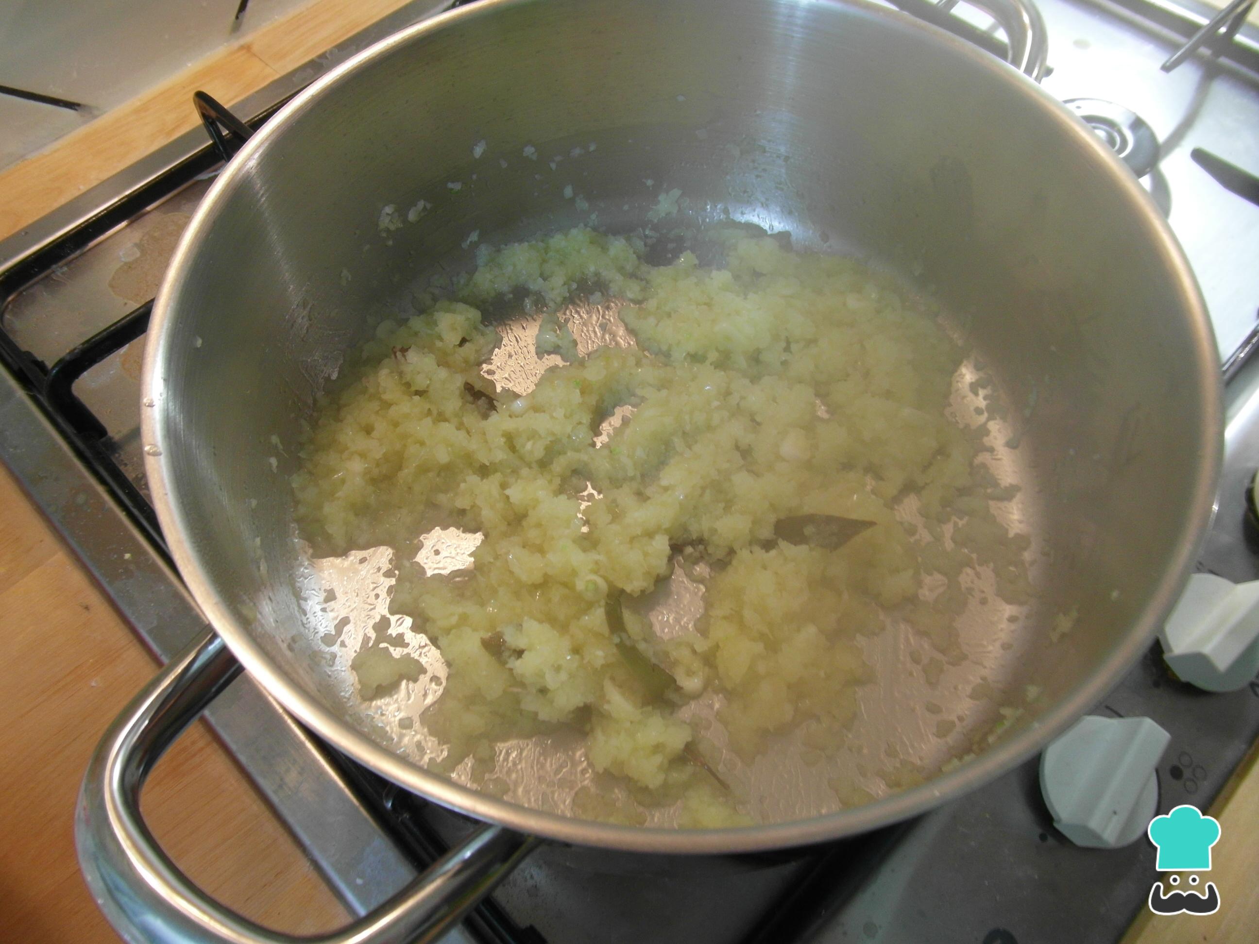 Em seguida, em uma panela de tamanho médio, refogue a cebola e o alho com um fio de azeite e acrescente o arroz. Refogue tudo junto até o arroz ficar ligeiramente transparente.