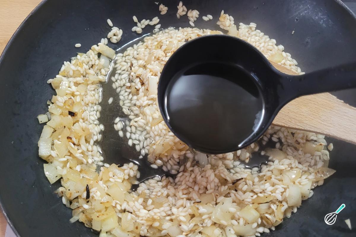 Quando quase todo o vinho tiver secado, comece a adicionar o caldo de legumes já quente concha a concha.