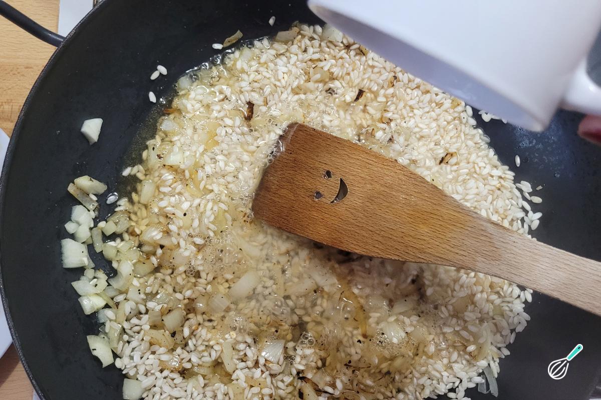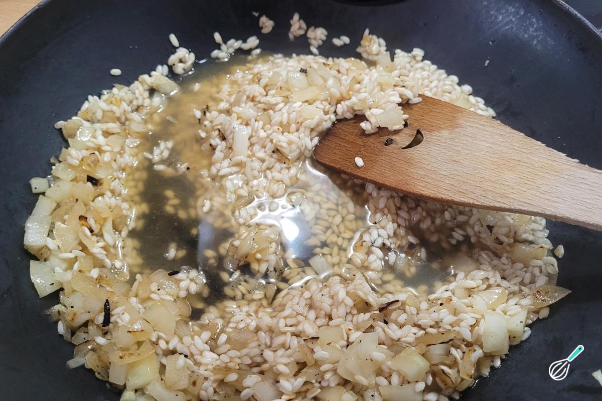 Mexa bem e deixe refogar por 1 minutinho para que os grãos do risoto fiquem envolvidos com o azeite.