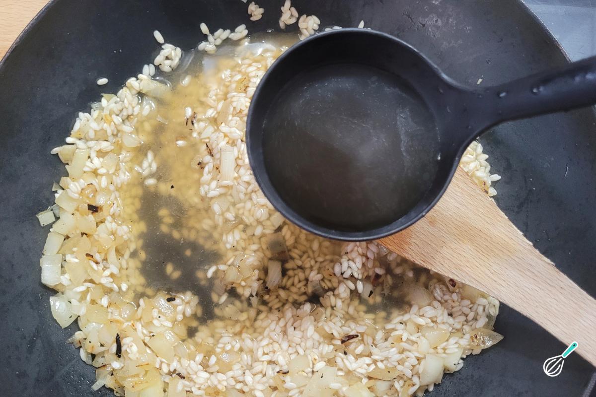 A ideia é ir adicionando o caldo aos poucos, sempre mexendo, até que o arroz esteja caldoso, mas al dente, sem estar muito mole. É isso que garante que o amido do arroz vai sendo liberado e dando a cremosidade, sem adicionar nenhum tipo de creme.