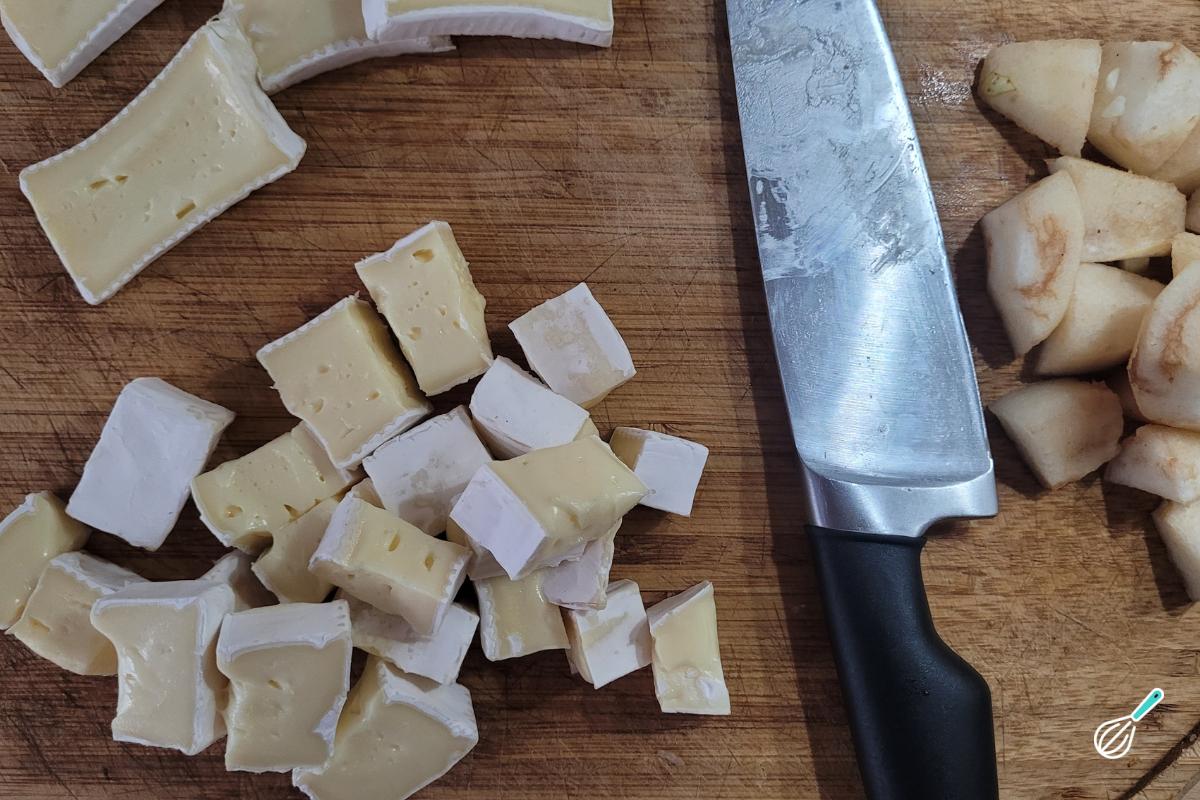 Corte o queijo brie em cubos e se quiser reserve algumas fatias um pouco maiores para colocar frescas no final.
