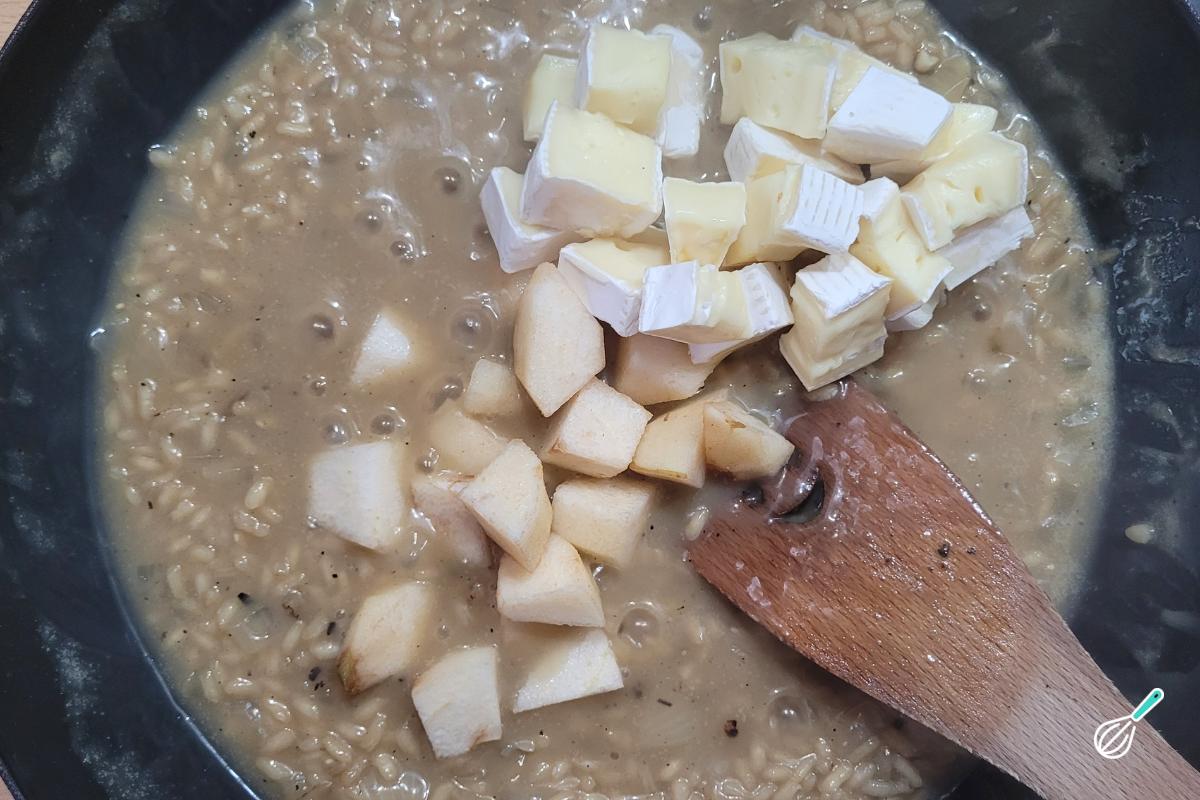 Quando o arroz estiver quase no ponto, na última adição de caldo, não deixe secar totalmente para que fique caldoso. Desligue o fogo e adicione as peras cortadas em cubos e o queijo brie.