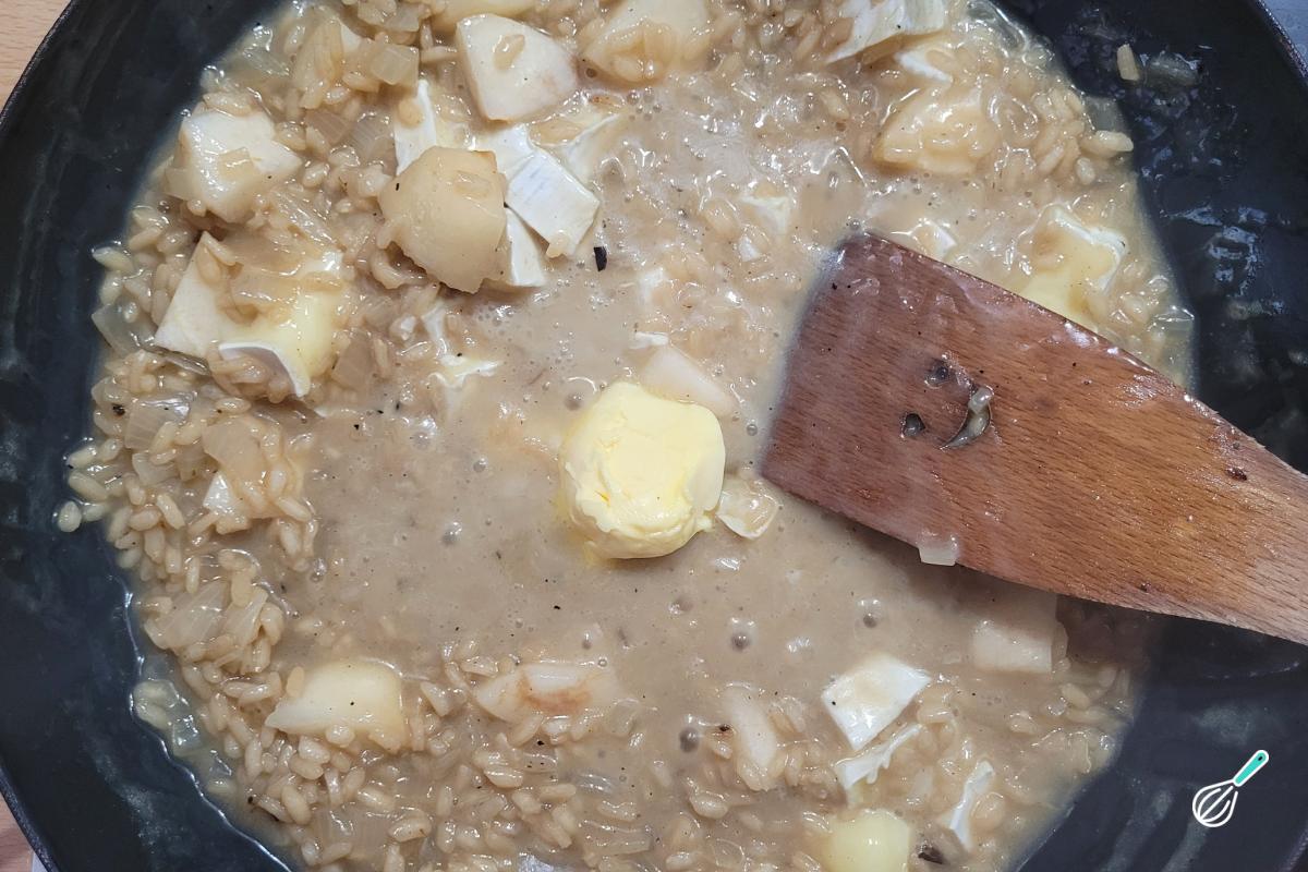 Adicione a manteiga gelada. Mexa para derreter a manteiga com o calor do risoto e deixar uma textura aveludada.