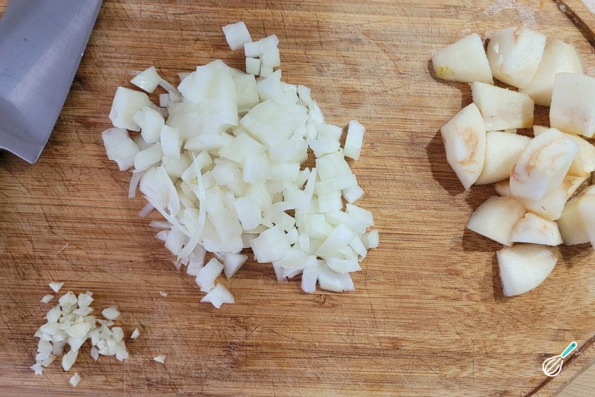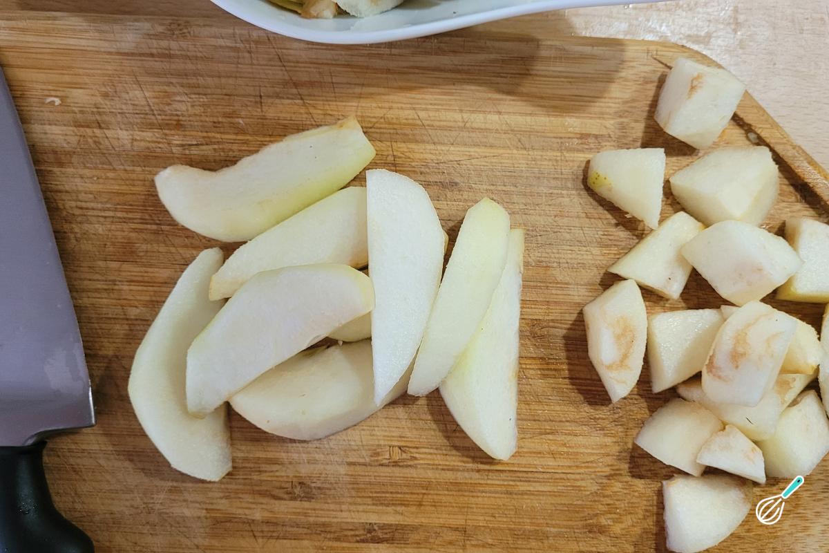 Comece preparando as peras. Descasque e tire as sementes. Corte uma das peras em cubinhos e a outra em fatias mais grossas para finalizar o risoto.
