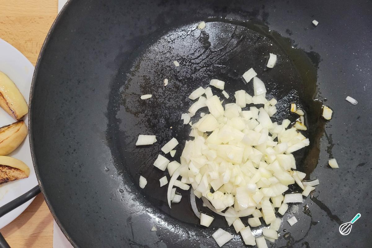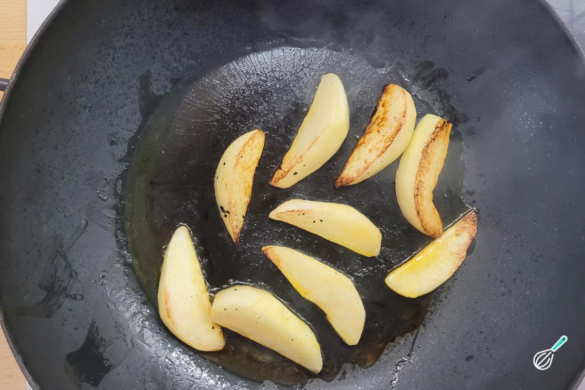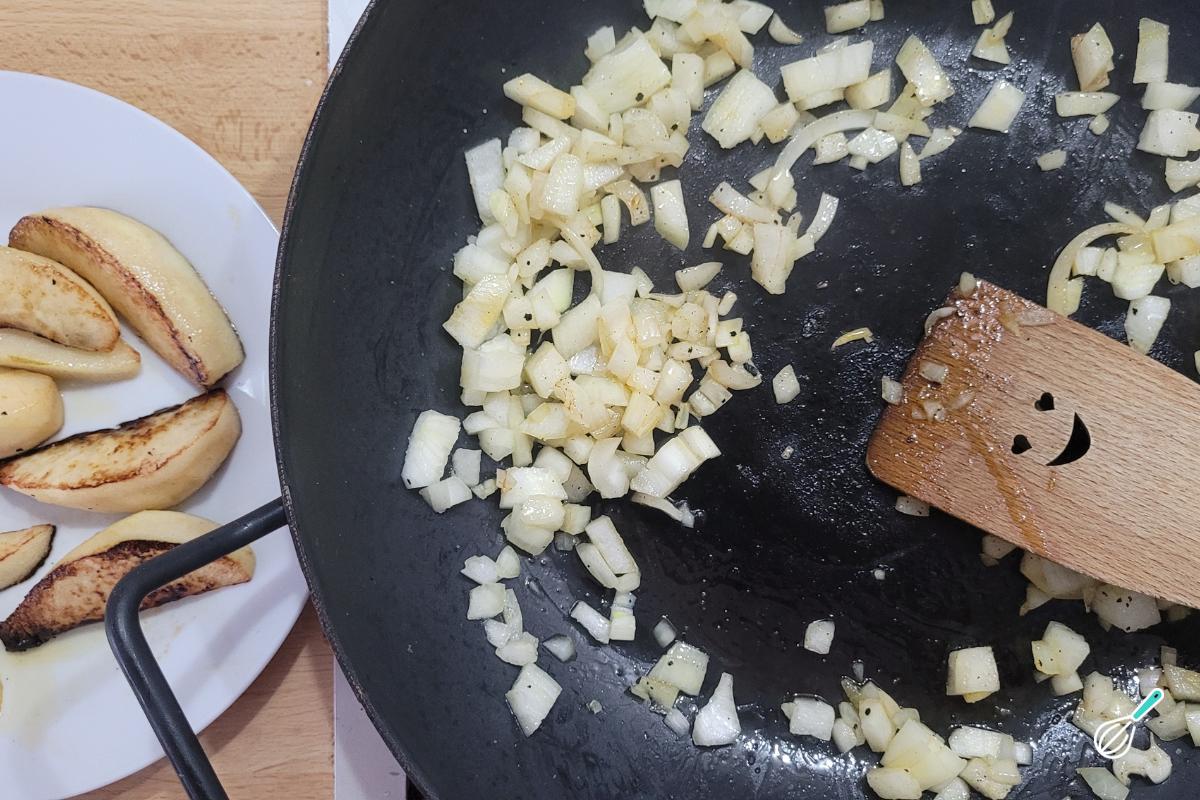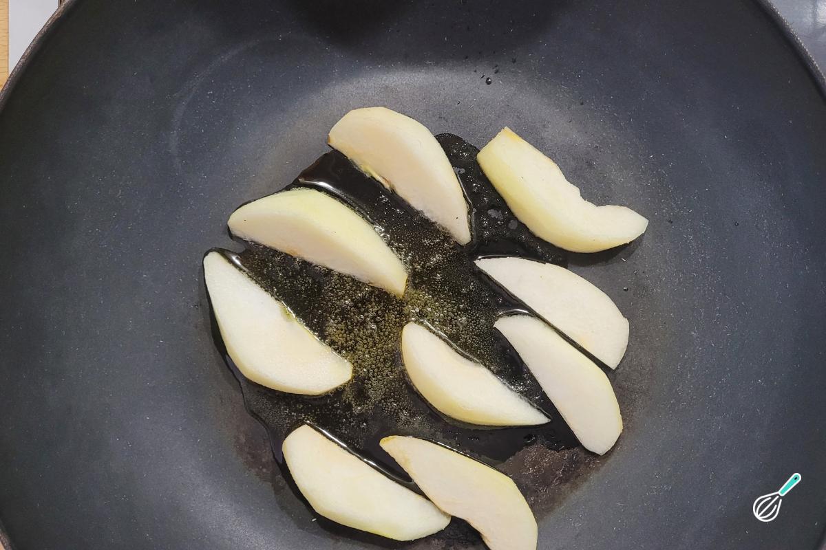 Em uma frigideira grande, coloque uma colher de sopa de azeite e a pera que vai finalizar o risoto para caramelizar.
