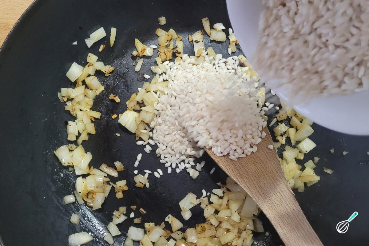 Quando dourar, adicione o alho e deixe bem rapidinho apenas até perfumar e adicione o arroz para risoto.