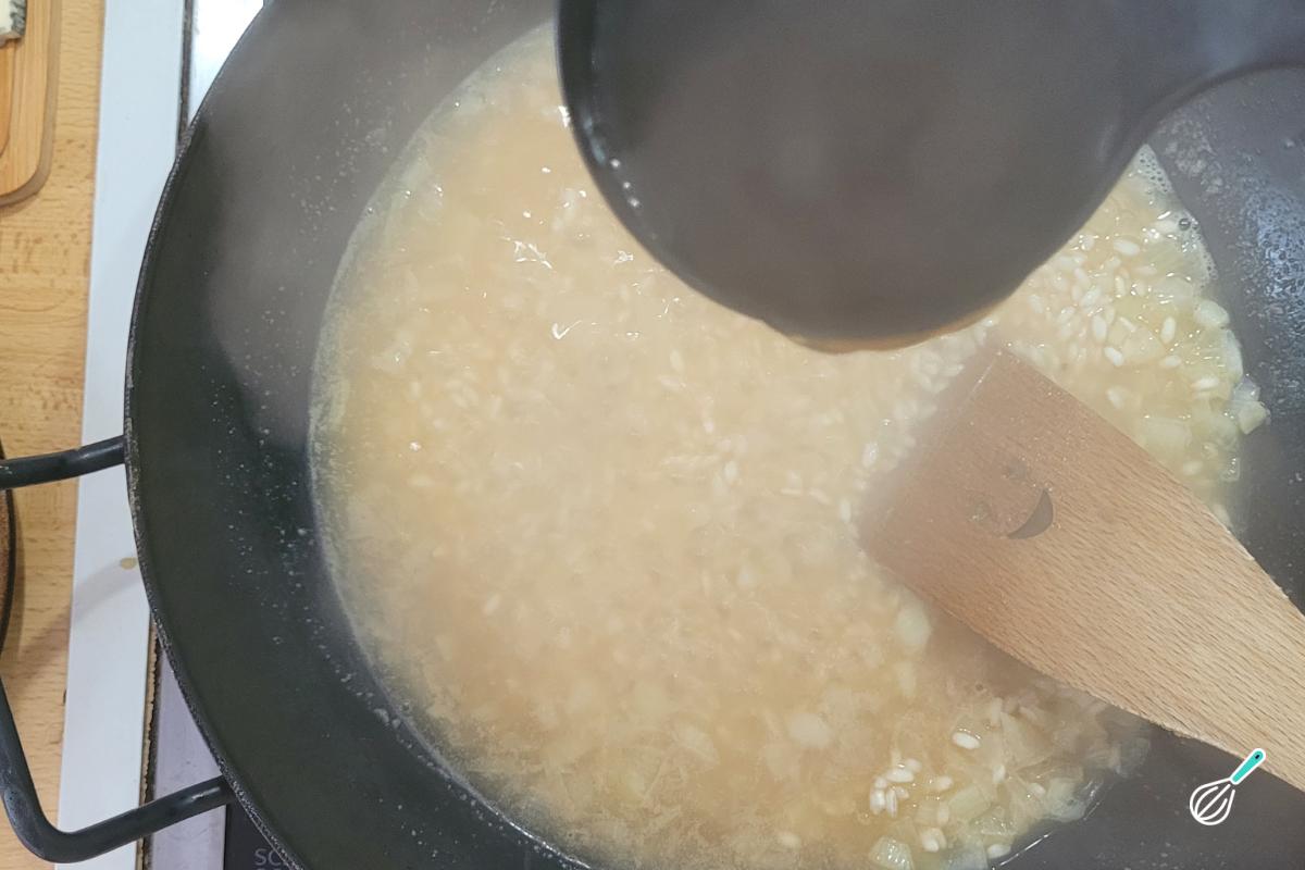Comece a adicionar o caldo de legumes já quente concha a concha. A ideia é ir adicionando o caldo aos poucos, sempre mexendo, até que o arroz esteja caldoso, mas al dente, sem estar muito mole.