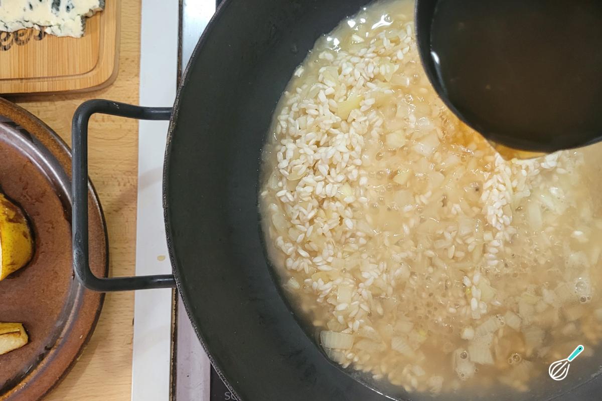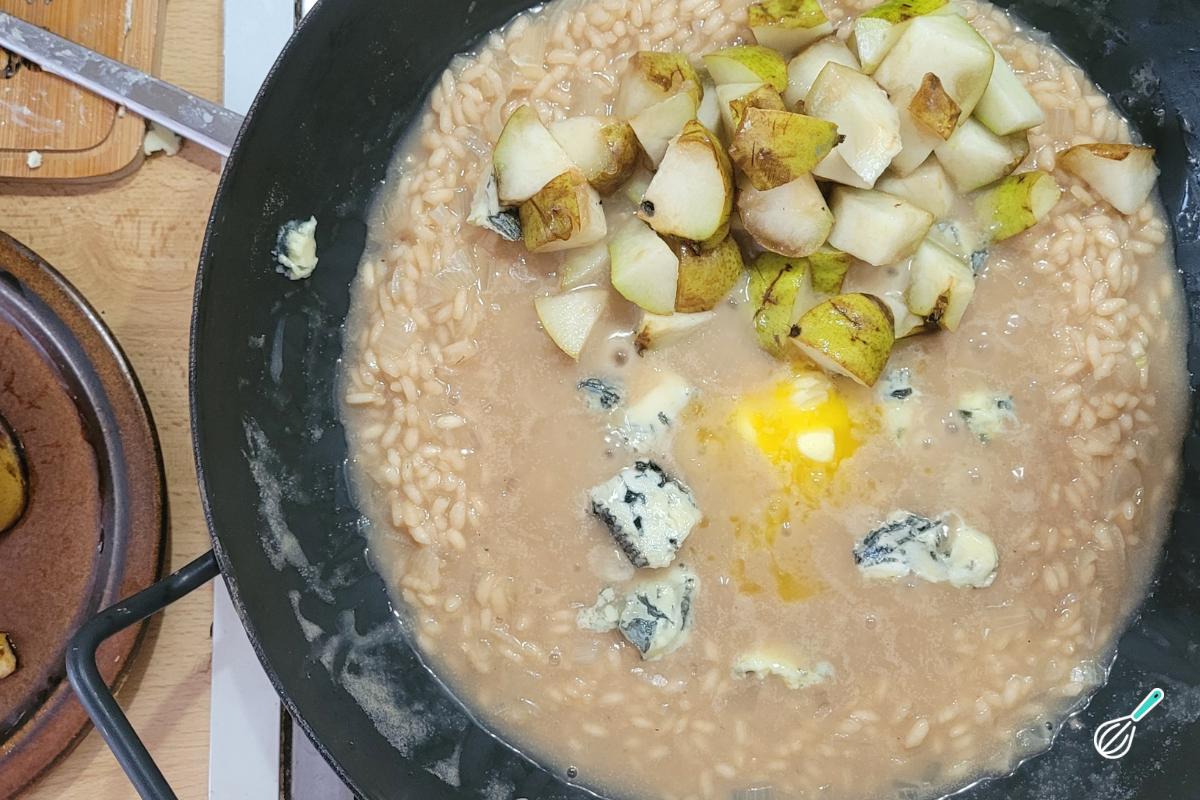 Desligue o fogo e adicione as peras cortadas em cubos, o gorgonzola esfarelado e a manteiga gelada. Mexa para derreter a manteiga com o calor do risoto e deixar uma textura aveludada.