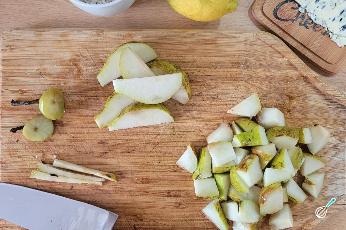 Comece preparando as peras. Não precisa descascar. Tire as sementes e corte metade de uma pera em quartos para finalizar o risoto. Corte o restante em cubos pequenos.