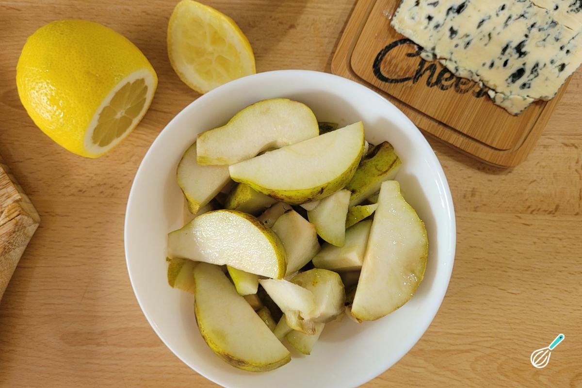 Transfira a pera cortada para uma tigela e regue com o suco de limão. Isso vai evitar que a pera escureça.