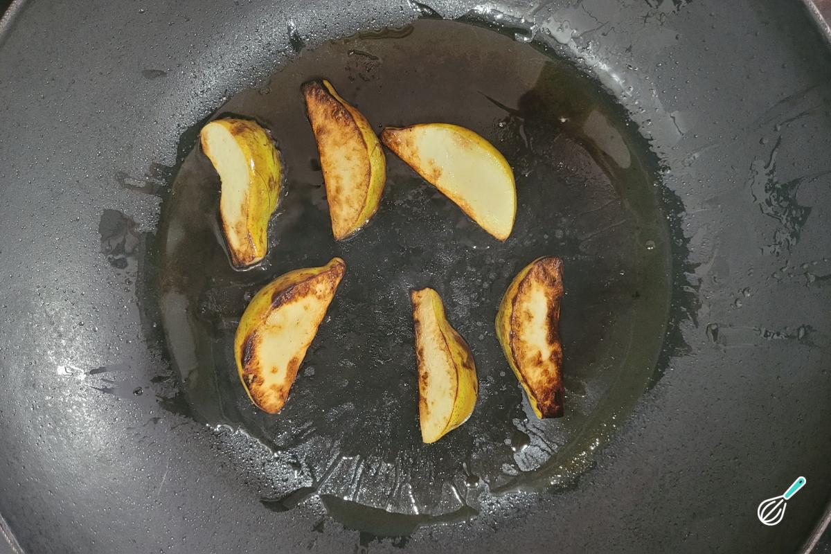 Em uma frigideira grande, coloque uma colher de sopa de azeite e a pera que vai finalizar o risoto para caramelizar.