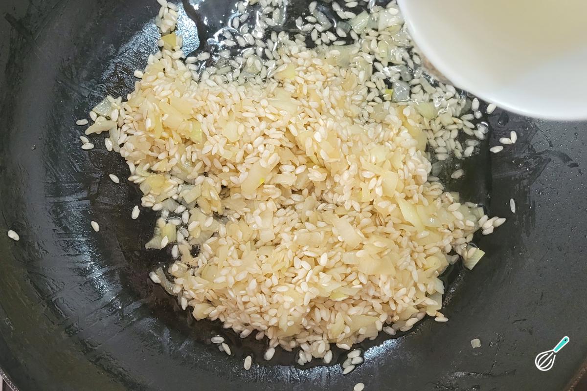 Tempere com sal e adicione o arroz. Tempere com pimenta do reino e deixe refogar por 1-2 minutos para que os grãos fiquem envolvidos com o azeite.