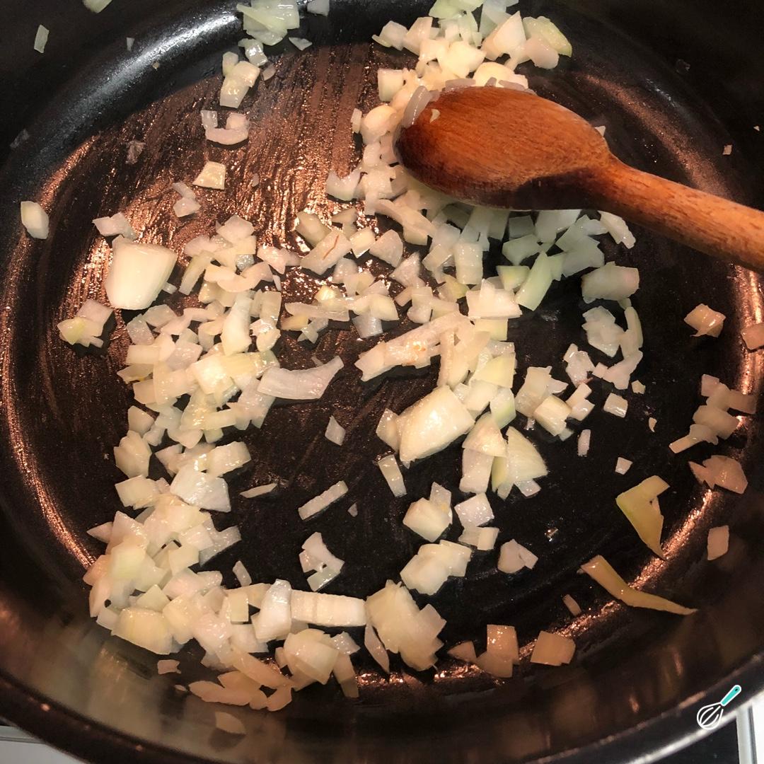 Em uma outra panela, refogue a cebola em um pouco de azeite.