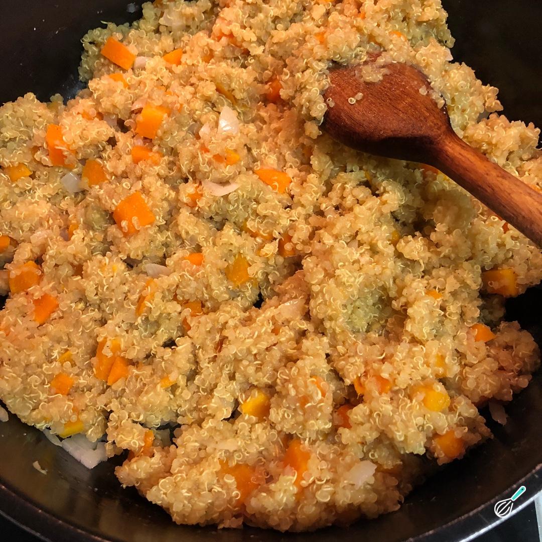 Junte a quinoa cozida ao refogado de cebola e misture bem.