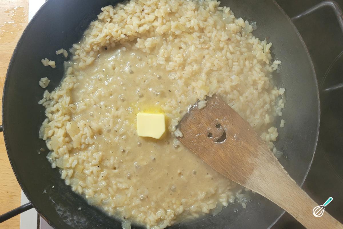 Desligue o fogo e adicione a manteiga - o ideal é que esteja gelada. É isso que vai criar uma textura aveludada para o risoto. Mexa bem até que a manteiga derreta com o próprio calor do risoto.
