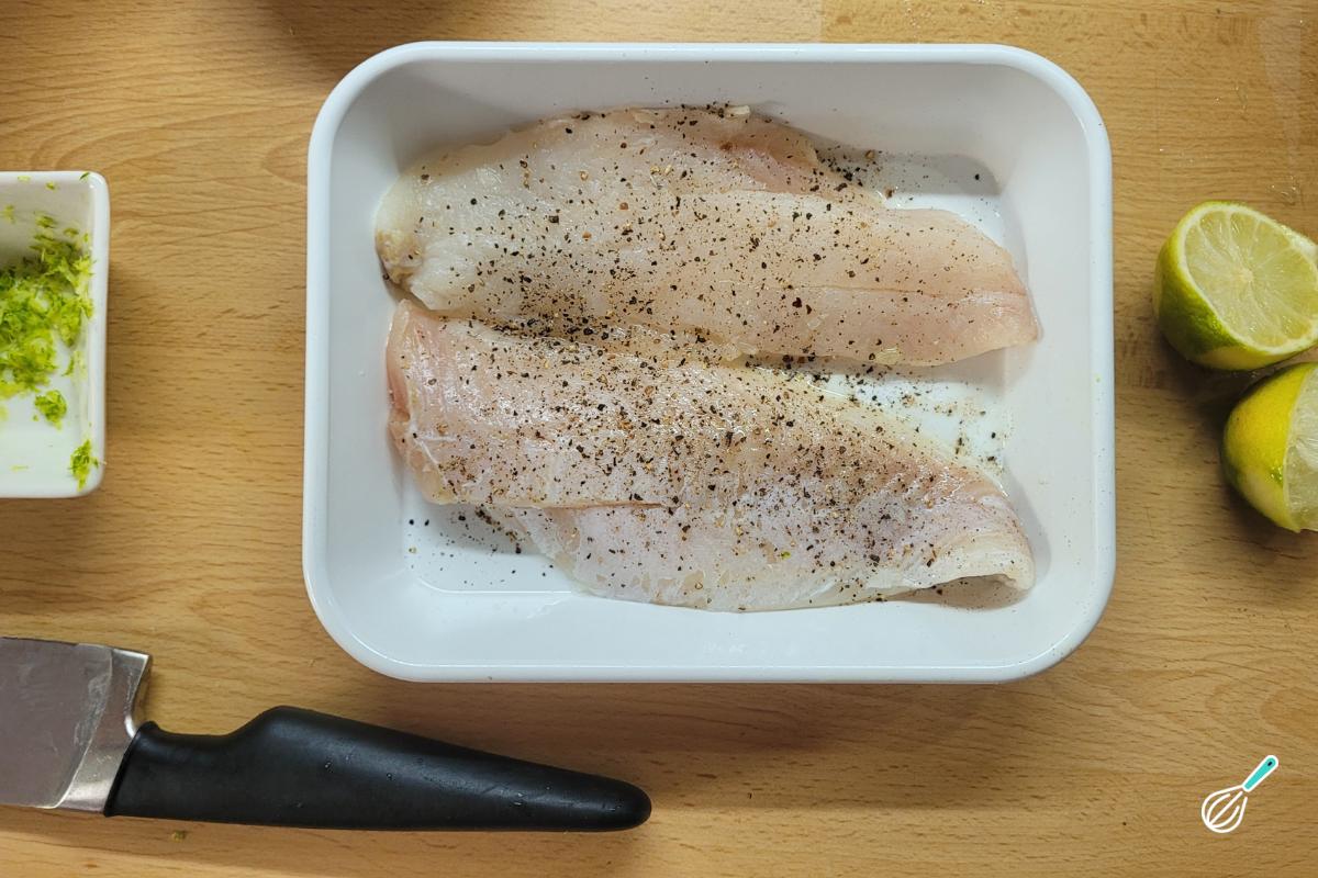 Tempere os filés de peixe com o suco do limão, sal e pimenta-do-reino e reserve por alguns minutos.