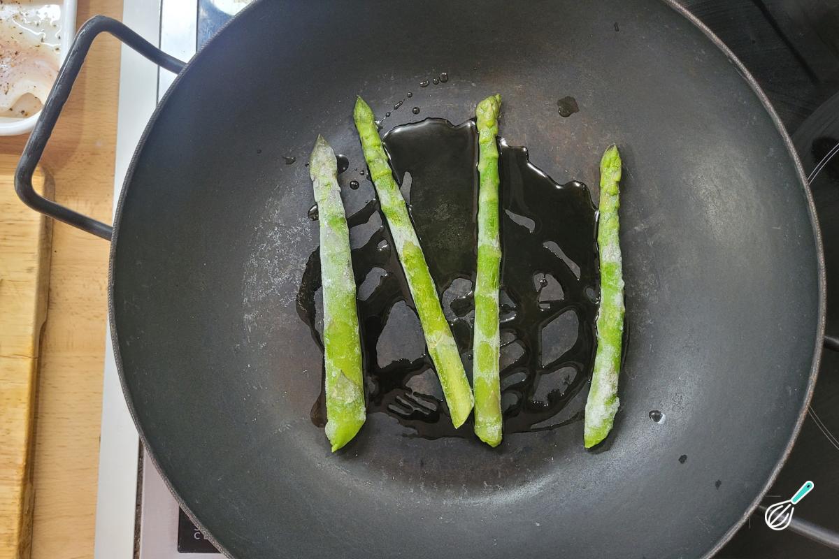 Leve o azeite para esquentar em uma frigideira grande onde fará o risoto e adicione os aspargos (se estiver usando). Deixe dourar até que estejam cozidos, sem que estejam muito moles.