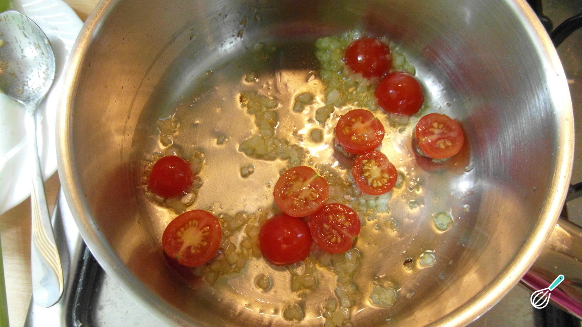 Numa panela em fogo médio, refogue a cebola picada e os tomates cortados ao meio, junto com o azeite. Esta é a base do risoto de tomate.