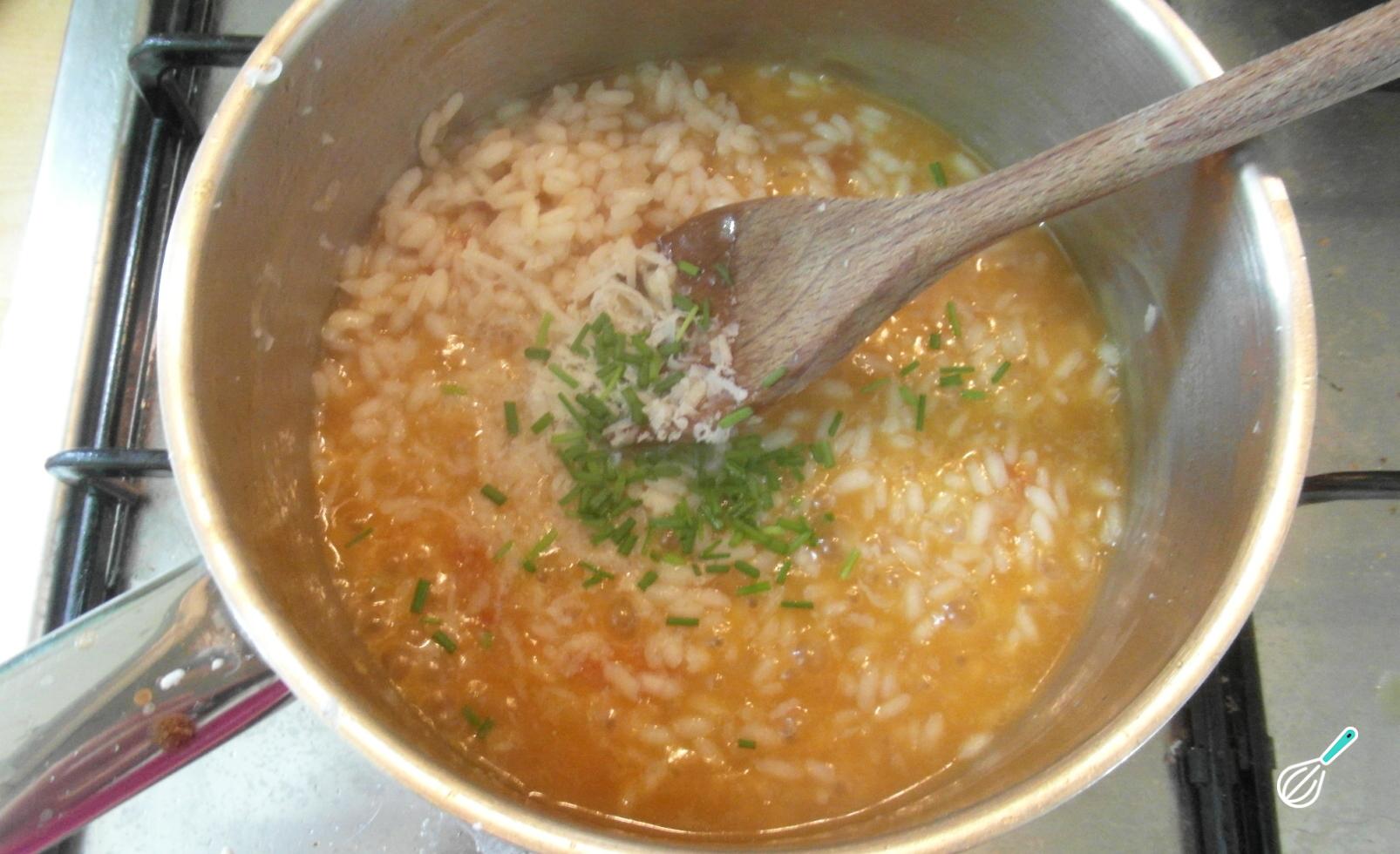 Quando tiver esgotado toda a água, o arroz deverá estar cozinhado. Prove e confira, o ideal é que esteja cremoso e ligeiramente cru. Retire a pele dos tomates, tempere com sal (use pouco sal, pois o tablete de legumes já é salgado) e acrescente o queijo e a cebolinha. Mexa e termine de cozinhar até o arroz ficar sem caldo.