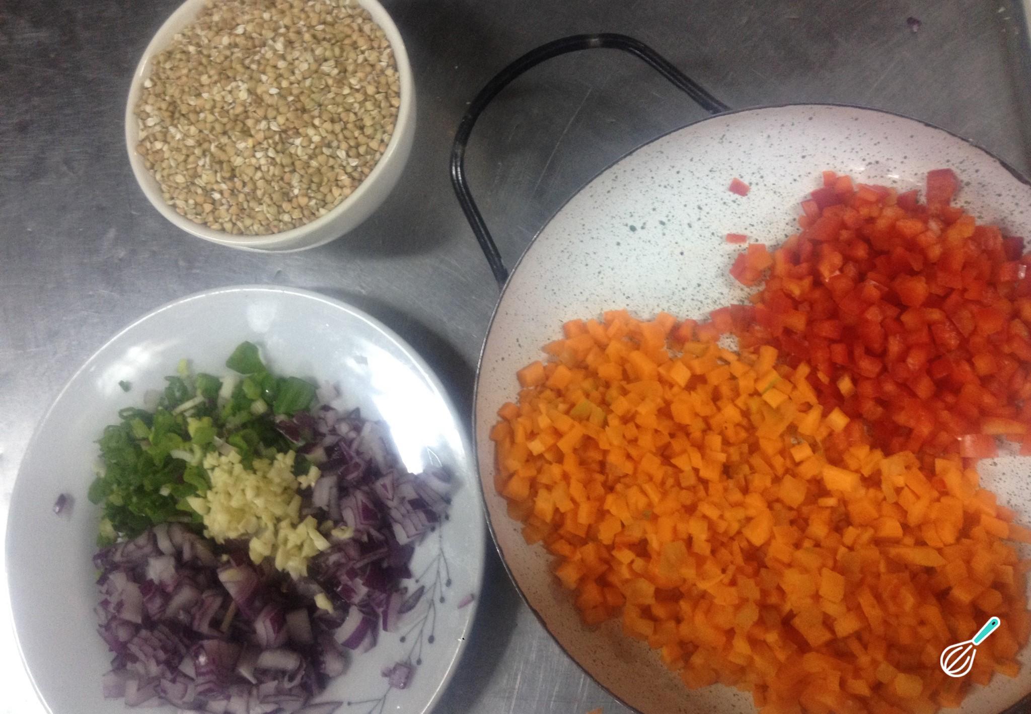 Para começar este prato primeiro reúna todos os ingredientes. Corte todos os legumes em cubos pequenos e o frango em tiras.