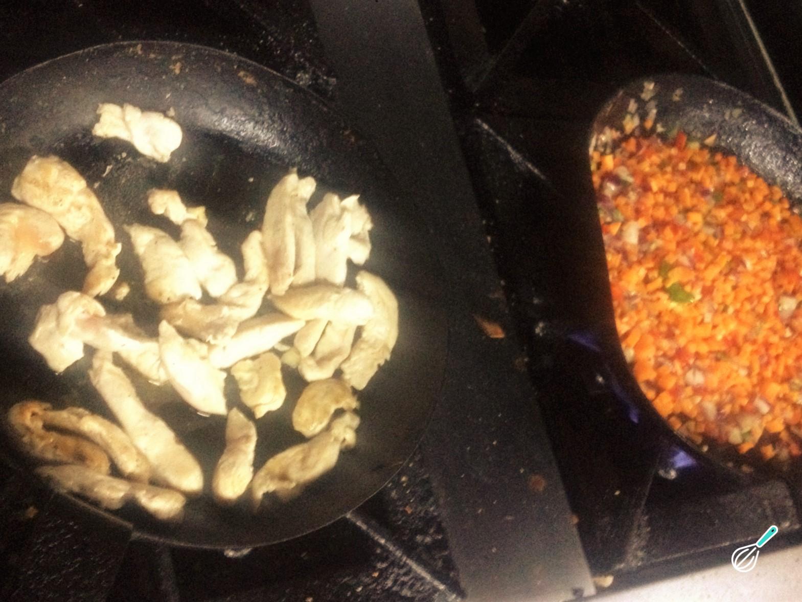 Coloque duas frigideiras no fogo e adicione um fio de óleo em cada uma. Cozinhe os legumes em uma delas até que a cebola fique transparente, e sele o frango na outra.