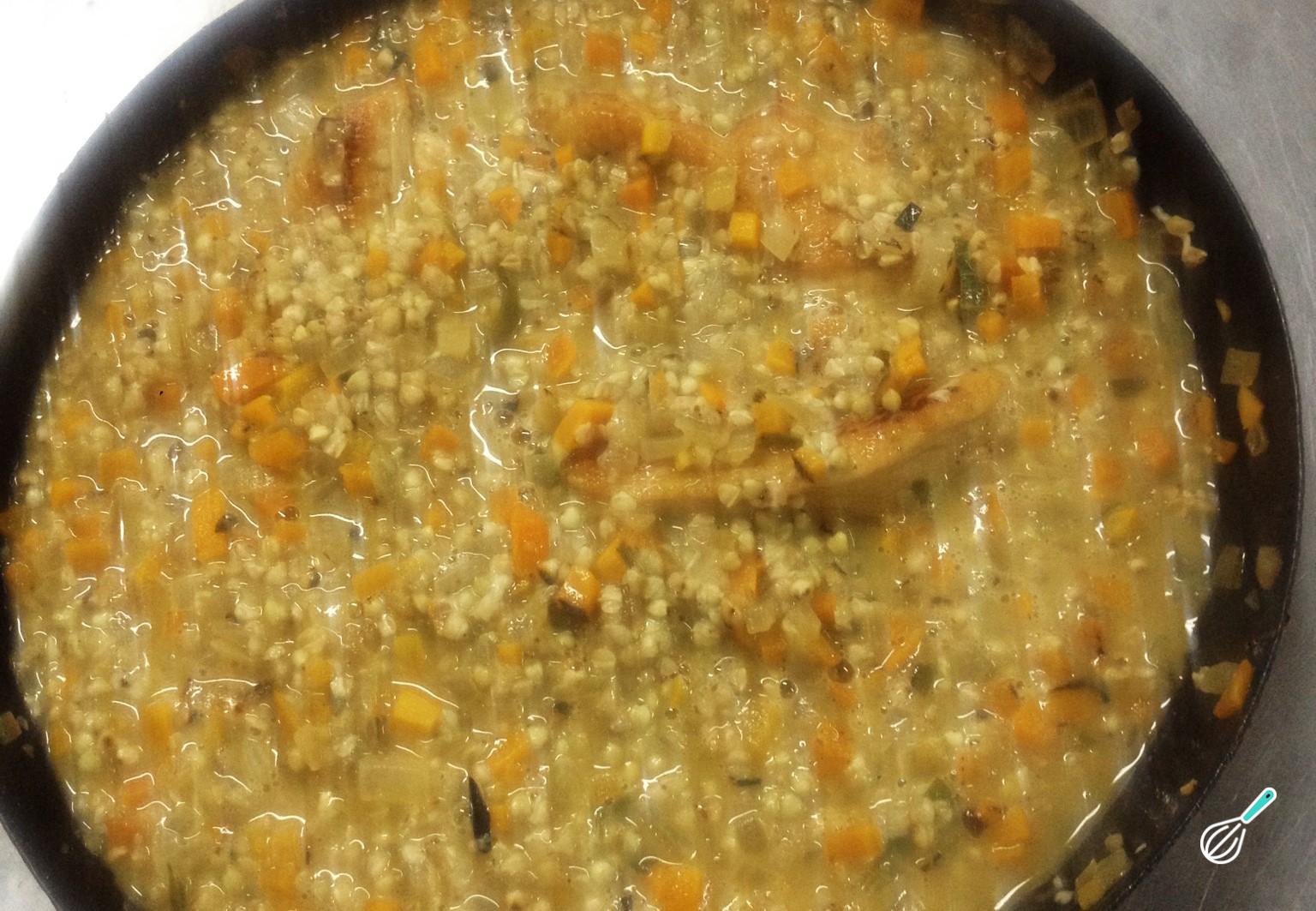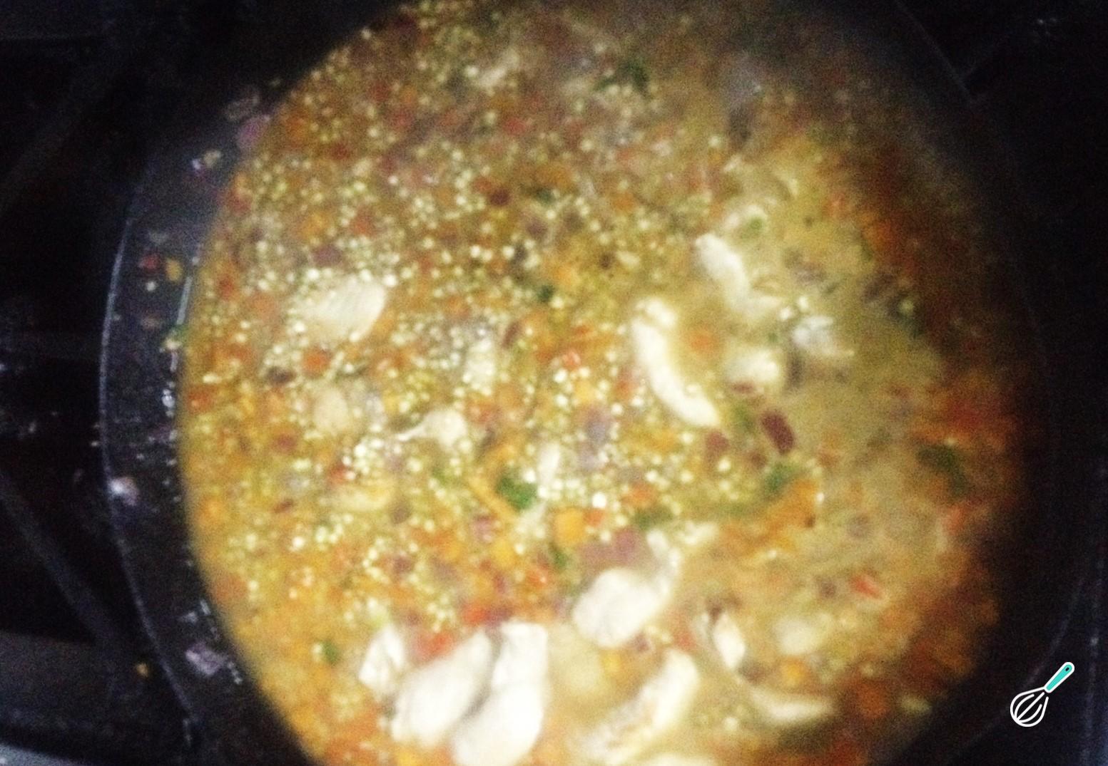 Adicione o frango à preparação de legumes e incorpore o trigo. Mexa e deixe cozinhar por 1 minuto. Depois junte o caldo de legumes e continue cozinhado em fogo baixo por 10 minutos.