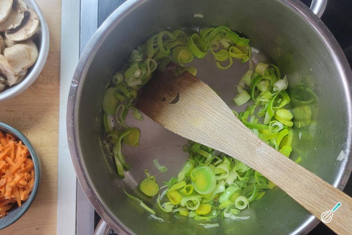 Em uma panela, coloque um fio de azeite e leve o alho poró cortado para refogar. Tempere com sal e deixe suar bastante até murchar.