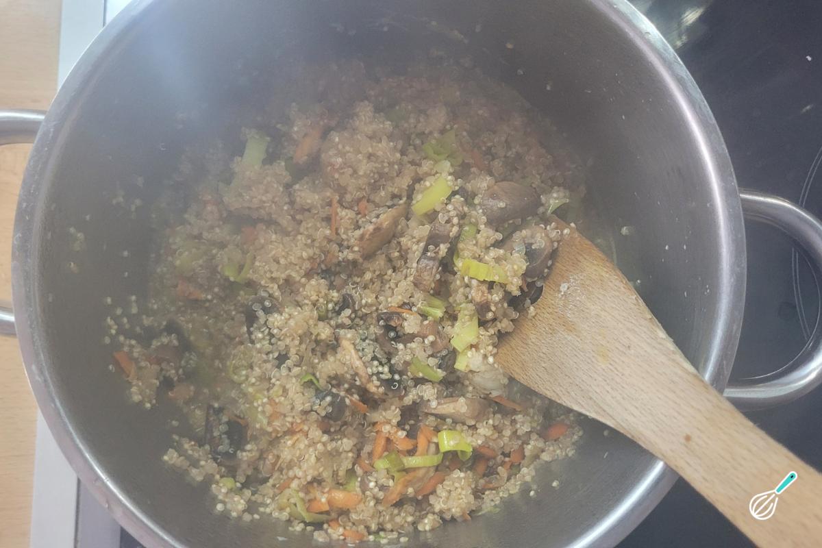 Adicione a quinoa e refogue por um minutinho para que o azeite envolva os grãos. Cubra com o caldo de legumes e quando ferver, abaixe o fogo até que a quinoa esteja cozida.