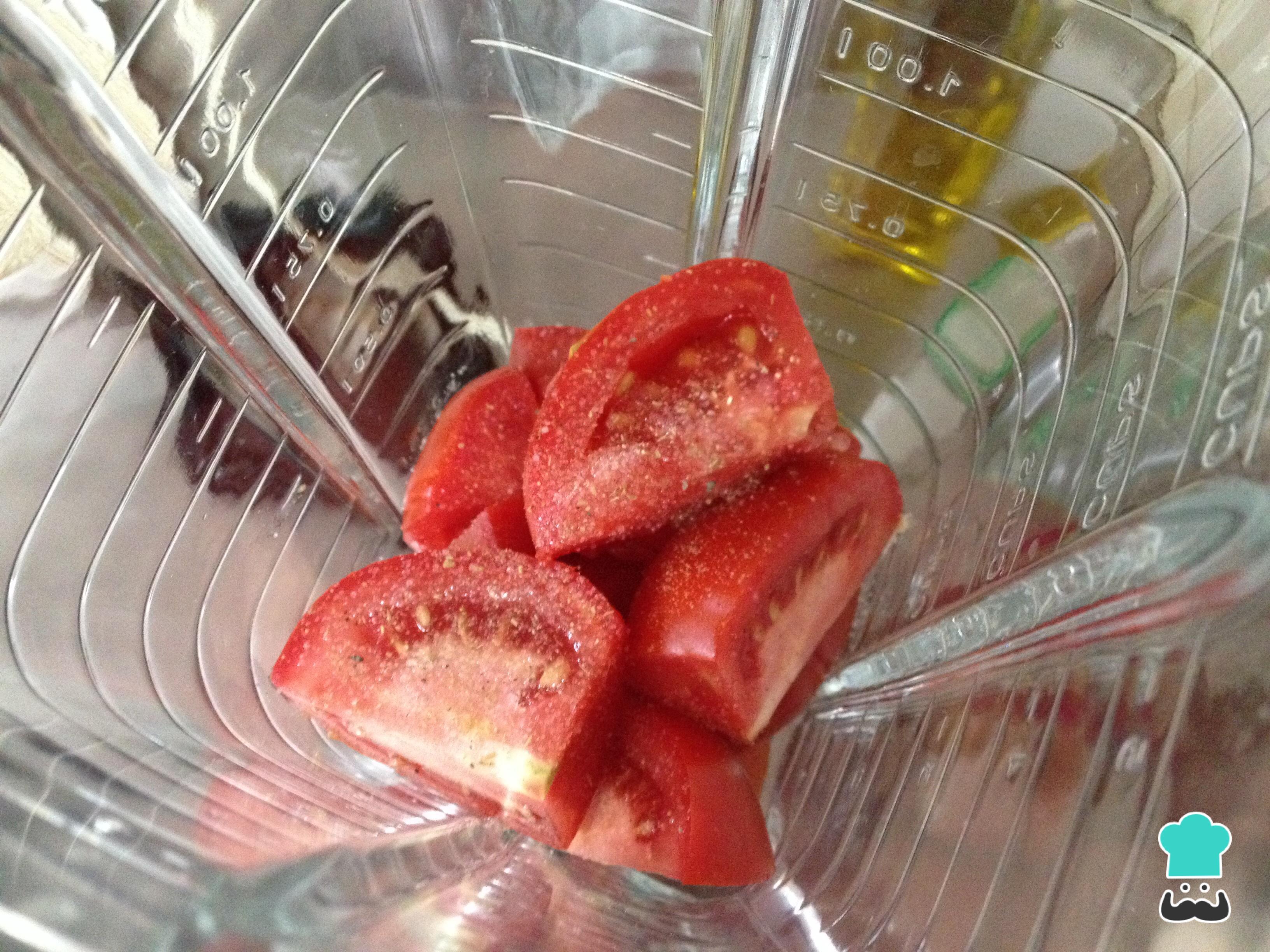 Bata os tomates no liquidificador com um pouco de sal, até obter uma polpa, depois coe para filtrar as sementes e a pele.