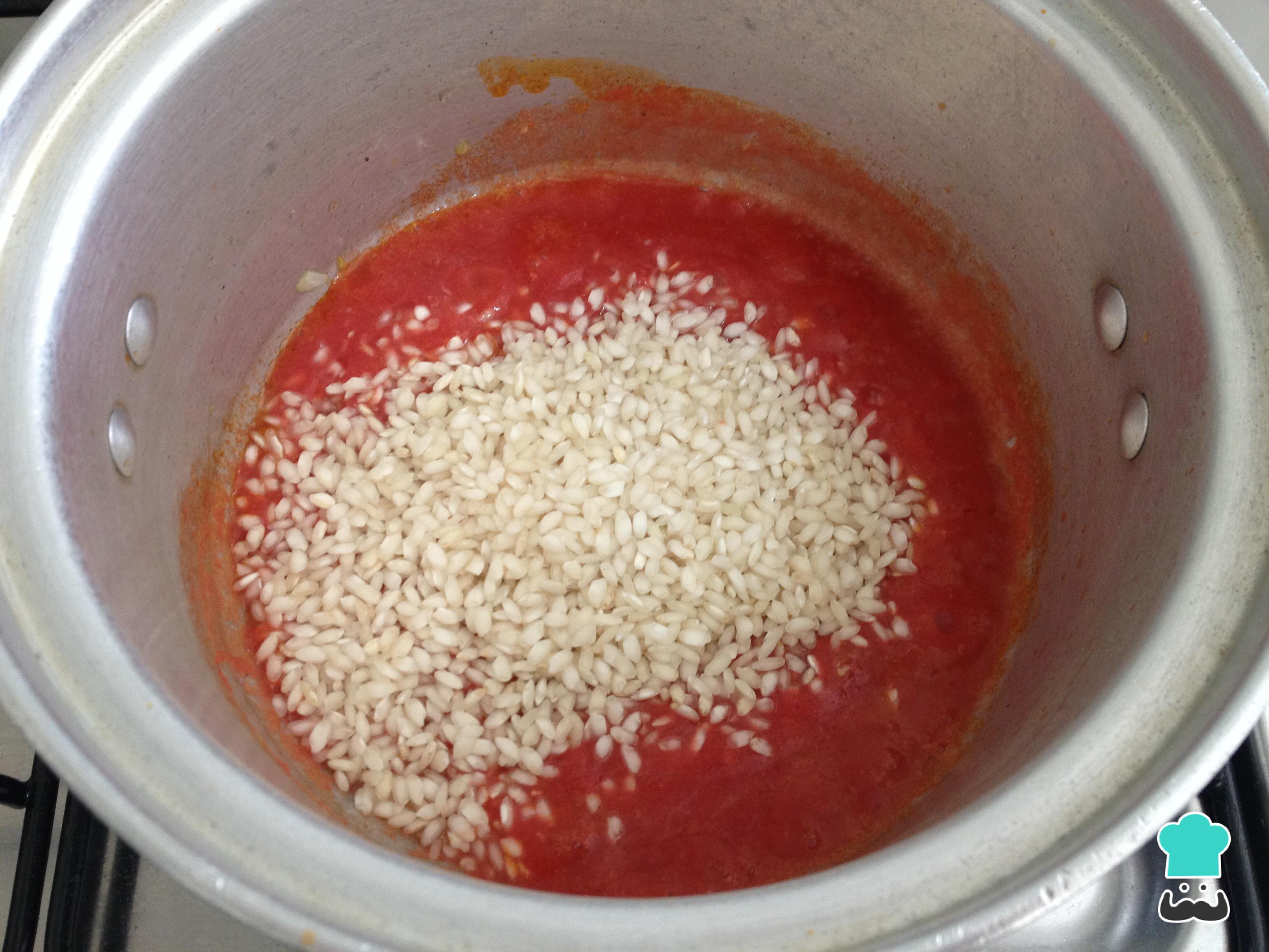 Adicione a polpa de tomate e o arroz à panela, e mexa por 1 minuto.
