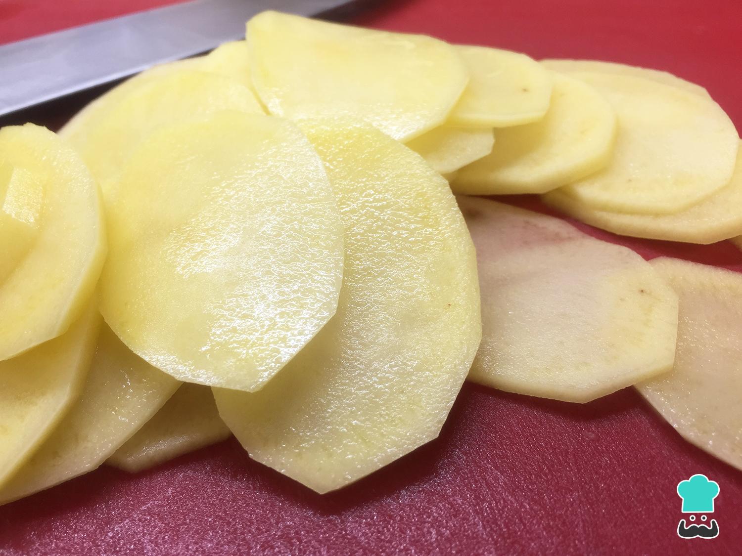 Comece por preparar os legumes: descasque a cebola e corte em juliana, descasque também as batatas e corte em fatias. Se você quiser pode também juntar pimentão e cenoura nesta receita, nesse caso corte em fatias ou rodelas.