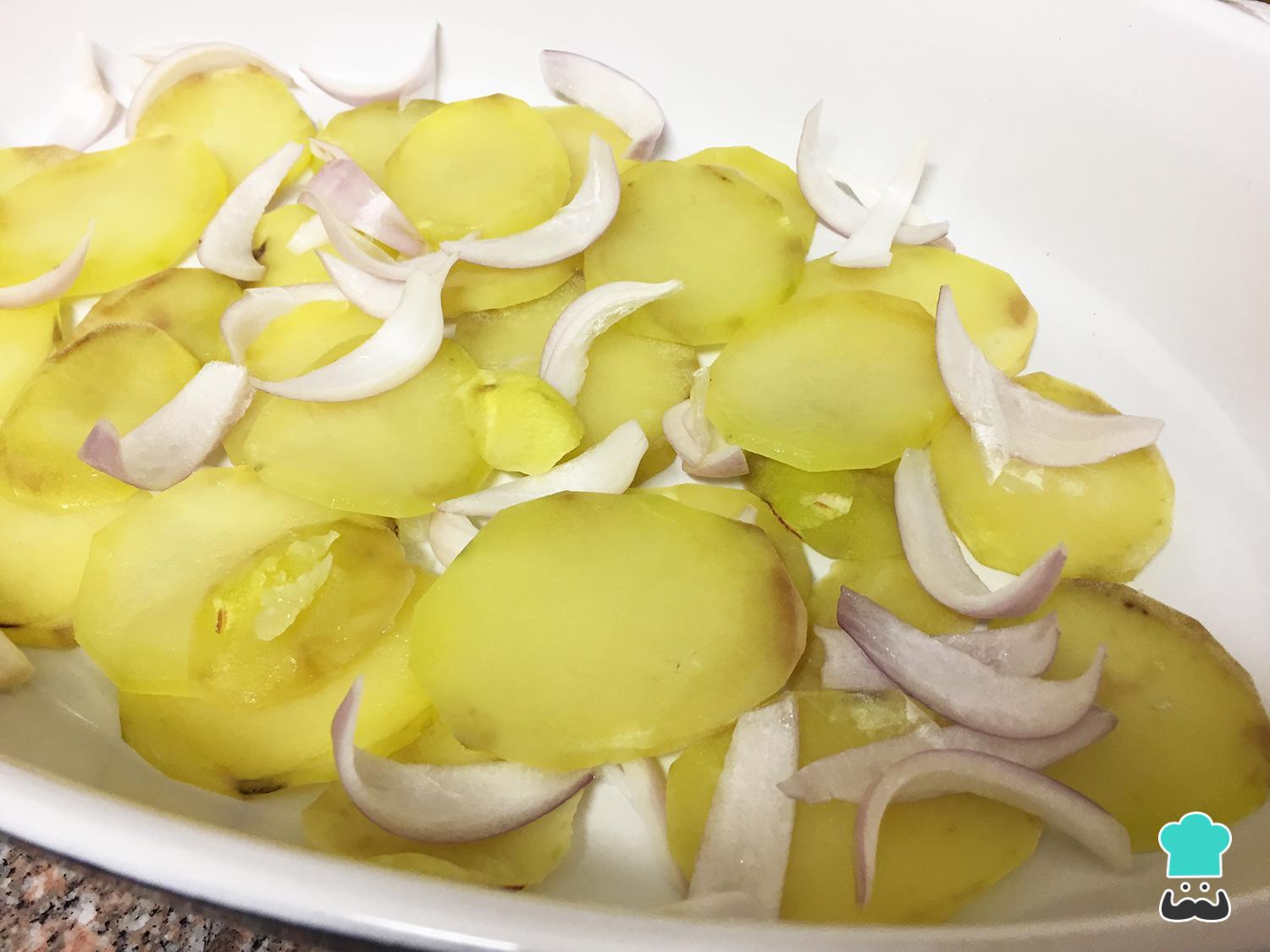 Coloque as batatas numa assadeira untada com azeite, coloque também a cebola, polvilhe sal e pimenta a gosto e regue com um pouco mais de azeite. Ligue o forno a 180ºC no grill e com ventilação.