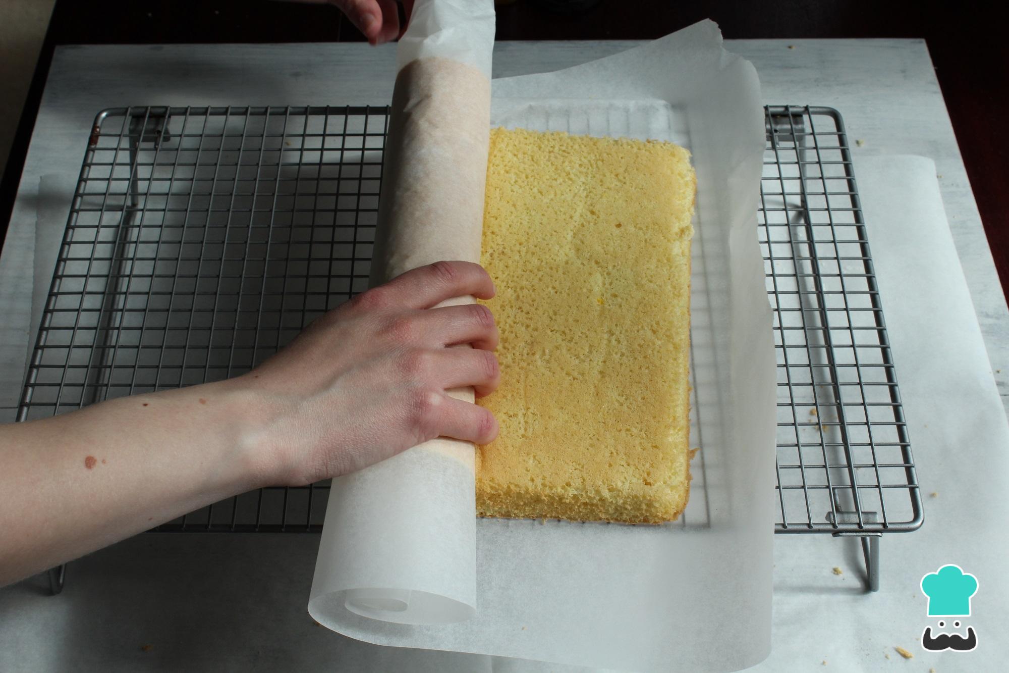 Retire o bolo do forno e desenforme ainda quente sobre um pano úmido ou outra folha de papel manteiga. Enrole como um rocambole e deixe ficar assim até esfriar completamente - isso ajudará a que a massa não quebre.