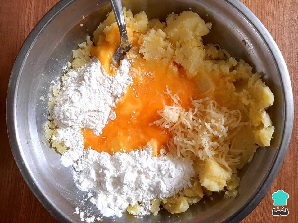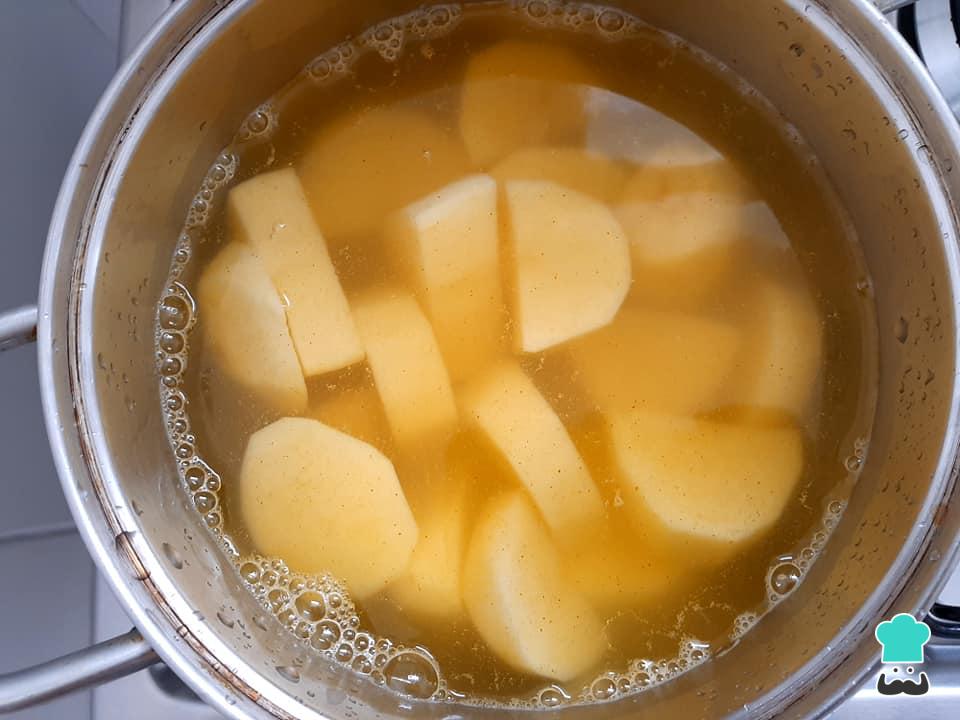 Descasque e cozinhe as batatas com água, sal e açafrão até ficarem macias. Escorra as batatas e amasse-as com um garfo ou amassador. Espere amornar para dar continuidade à receita.