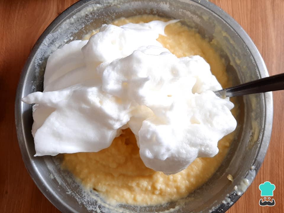 Bata as claras em neve e misture na massa reservada, delicadamente, para não perder o volume das claras. Tempere com sal e pimenta do reino.