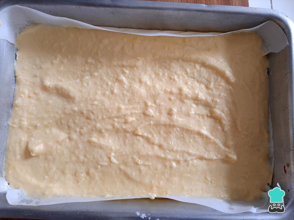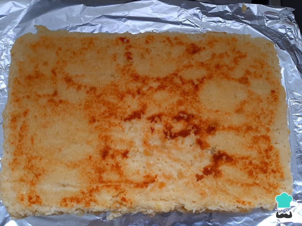 Coloque essa massa numa assadeira untada, coberta com papel manteiga ou enfarinhada, espalhando bem com o auxílio de uma espátula ou uma colher. Leve para assar em forno pré aquecido a 180-200 graus por 25 ou 30 minutos ou até dourar nas extremidades levemente e passar pelo teste do palito.