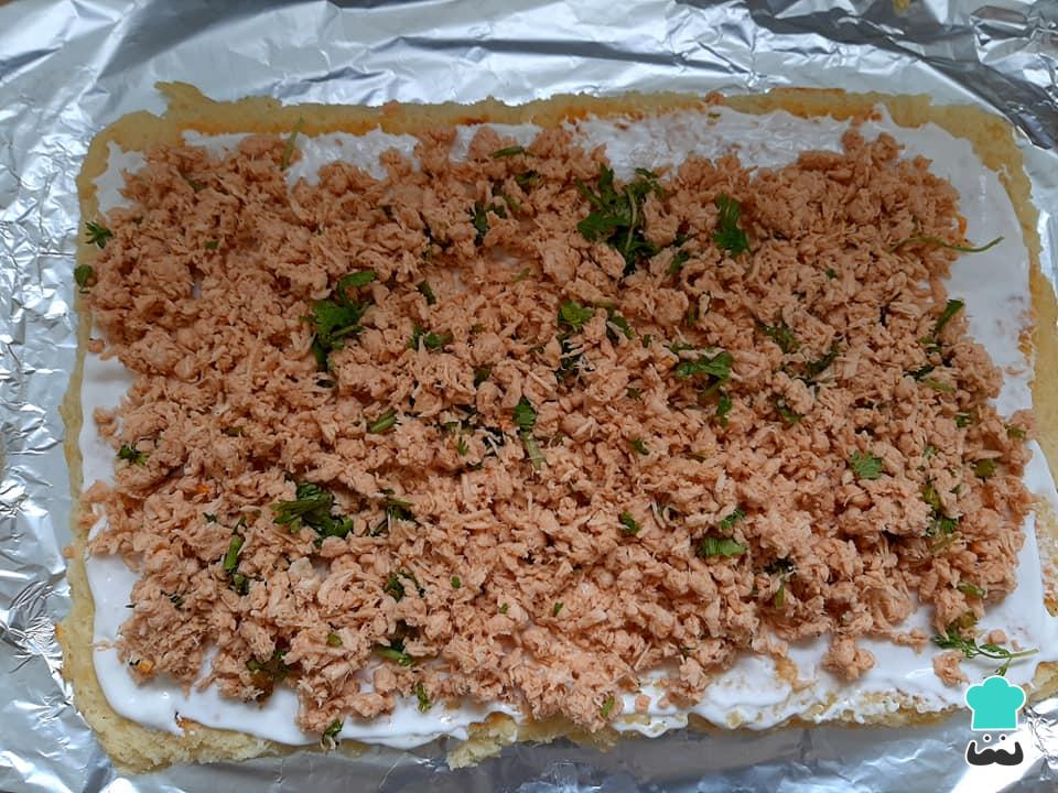 Passe requeijão cremoso sobre a massa e, em seguida, espalhe o recheio de frango cozido e desfiado, junto com a salsa picada.