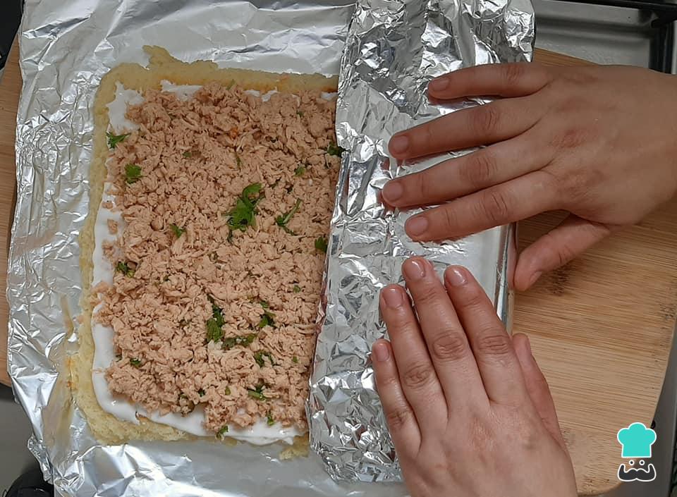 Retire a massa do rocambole salgado do forno e espere esfriar um pouco para virar sobre uma folha de papel alumínio. Retire o papel manteiga do fundo da massa para começar a rechear.