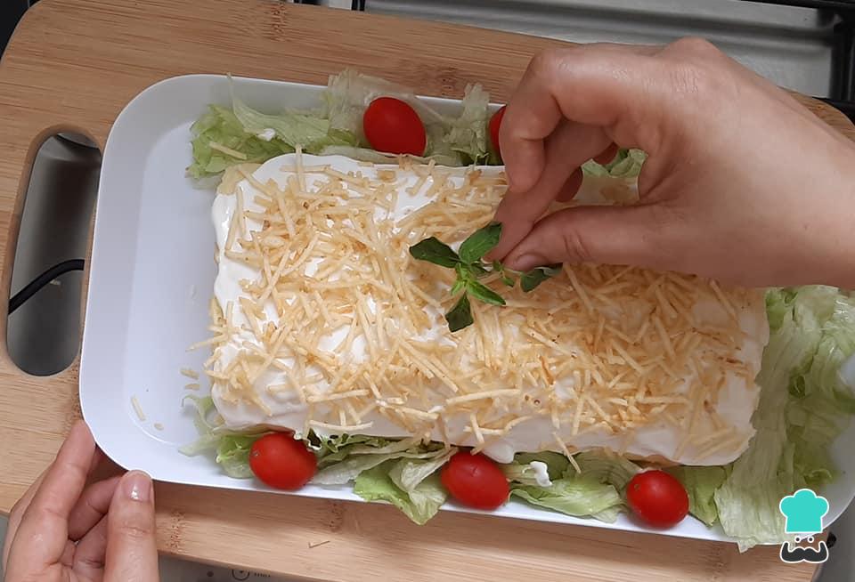 Dica: Caso deseje gratinar o rocambole, basta cobrir com fatias de muçarela e queijo parmesão ralado e levar ao forno novamente, até gratinar.