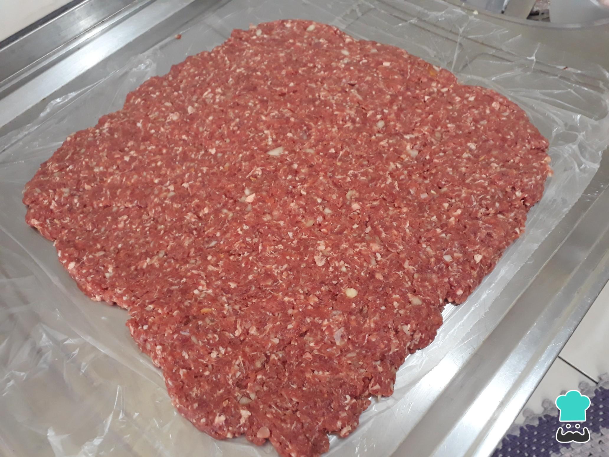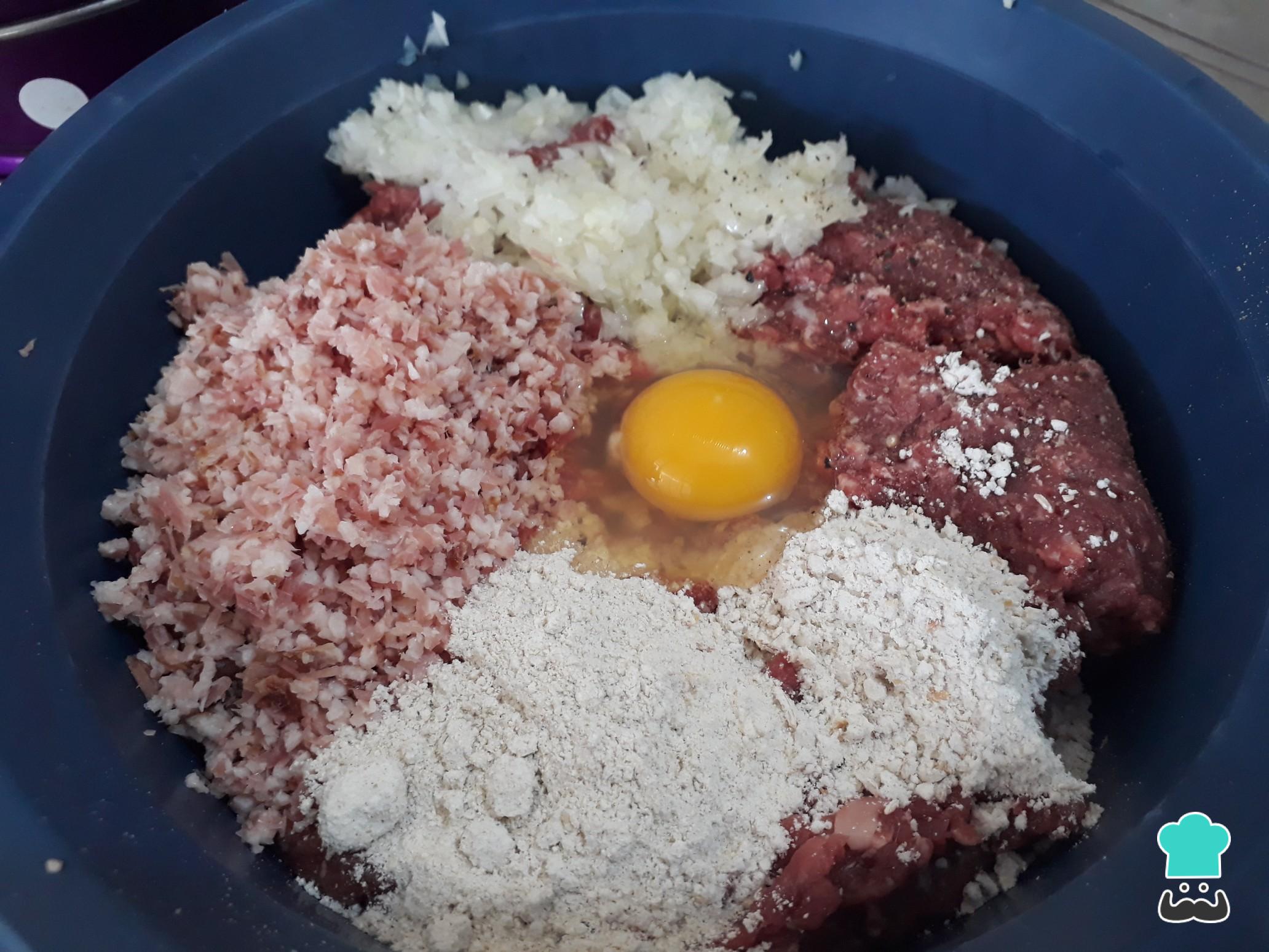 Primeiramente prepare a massa do rocambole: num bowl grande coloque a carne moída, o ovo, o creme de cebola, a aveia, a cebola, o alho, o bacon, a pimenta do reino e o sal. Misture tudo até ficar bem homogêneo.