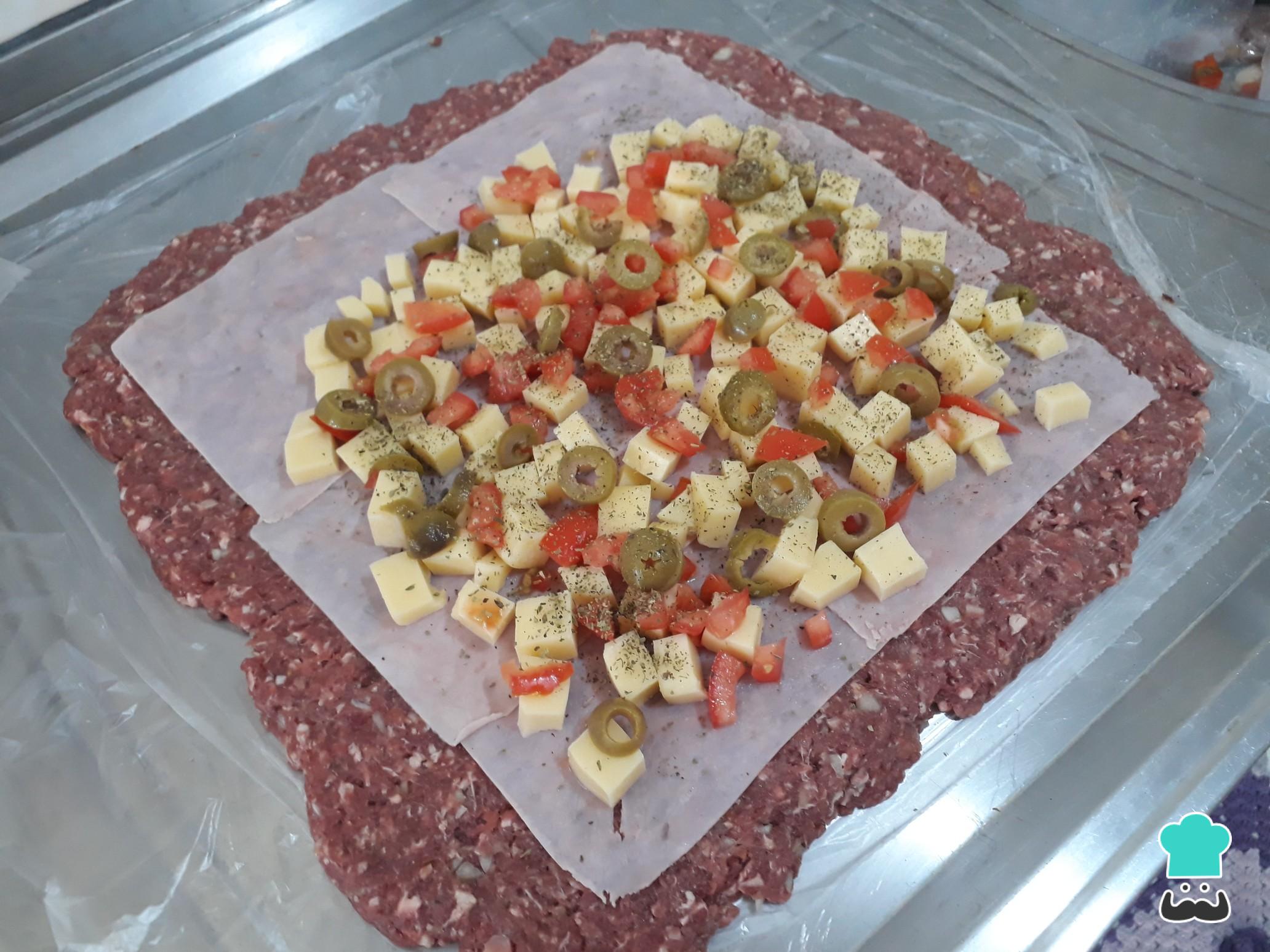 Para rechear primeiro coloque as fatias de presunto cobrindo praticamente toda a carne (elas ajudam o recheio a não escapar!), depois espalhe ao centro os cubos de mussarela, o tomate e a azeitona e polvilhe orégano por cima.