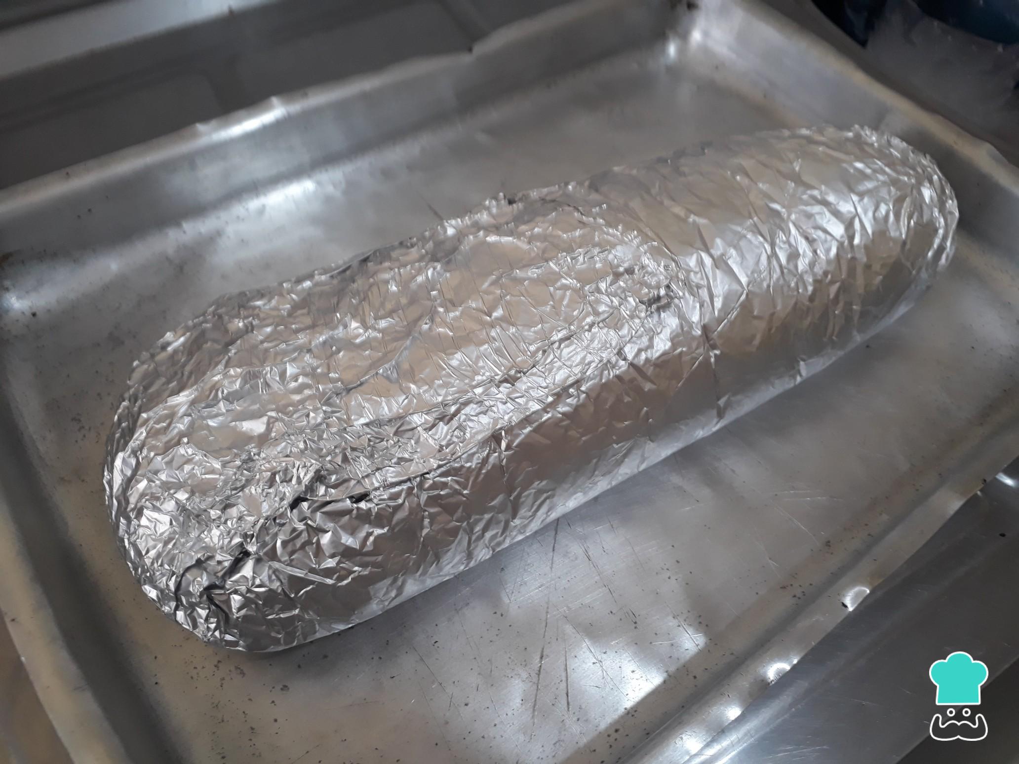 Na bancada abra uma folha de papel alumínio com o lado brilhante para cima e coloque o rocambole sobre ele. Retire o plástico do rocambole e enrole o rocambole no papel alumínio, como mostra a foto. Ajeite o rocambole em uma assadeira e leve para assar em forno pré-aquecido 200 graus por 40 minutos.