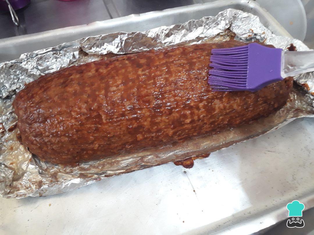 Depois de assar seu rocambole de carne moída com bacon retire o papel alumínio e, com o auxílio de um pincel, pincele molho barbecue em todo ele. Volte para o forno por 15 minutos ou até dourar.