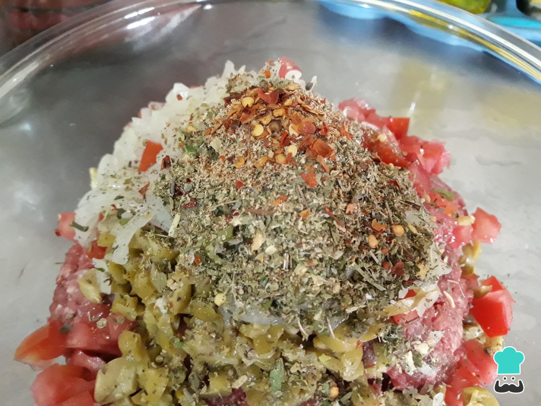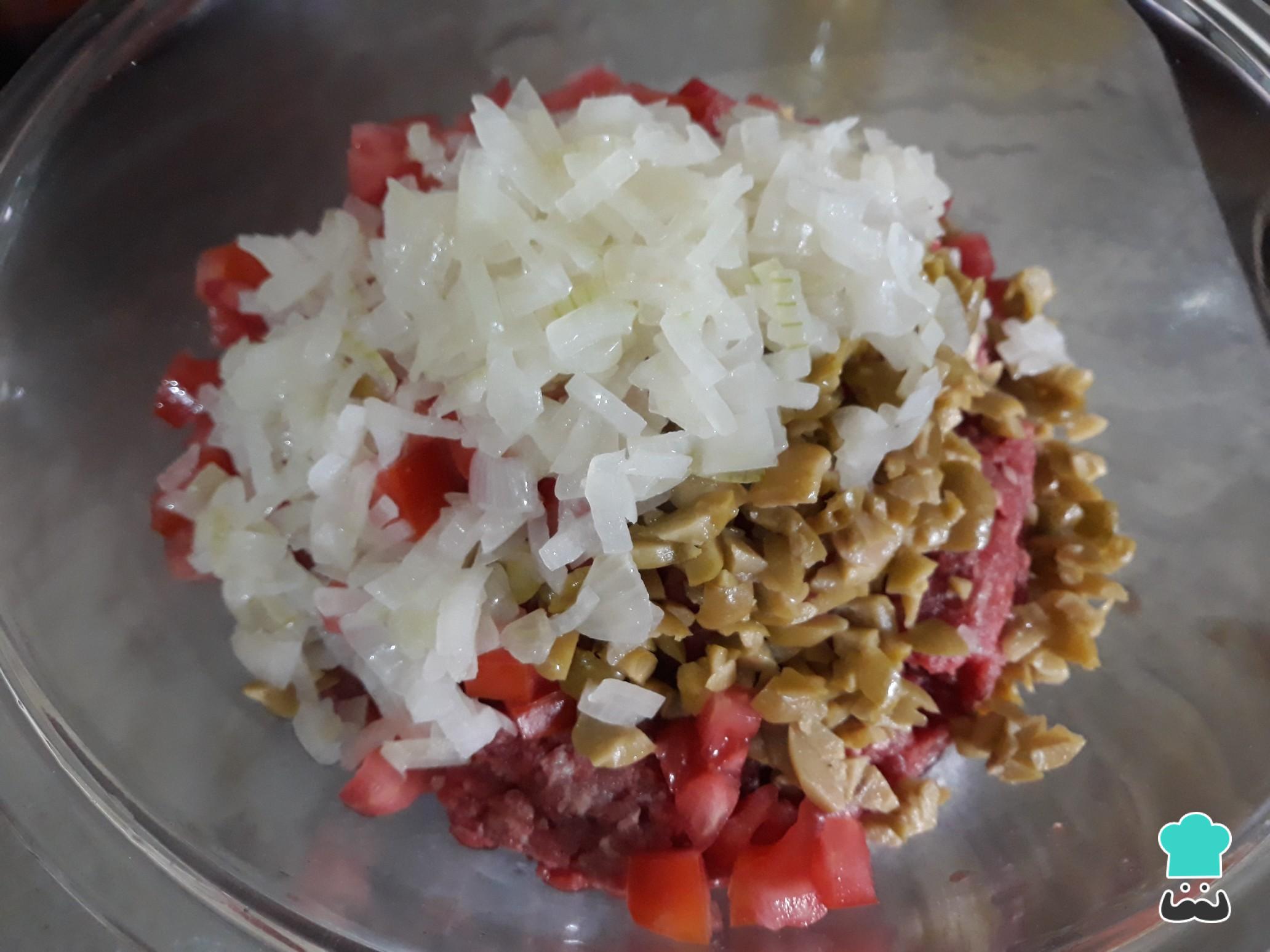 Em um bowl coloque a carne, a cebola, o tomate e as azeitonas.