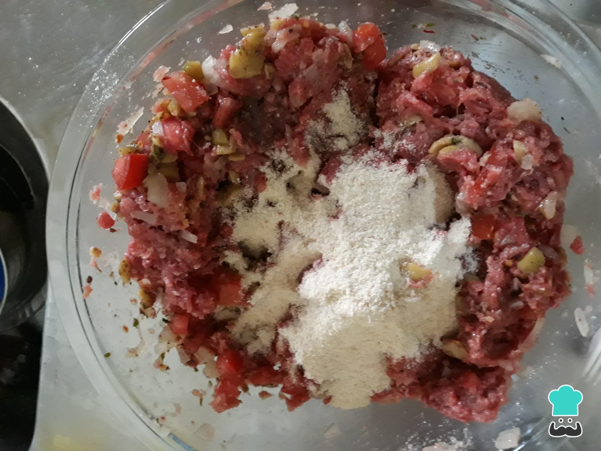 Acrescente à mistura a farinha de rosca, misturando sempre. Nesse momento o resultado deve ser uma mistura de carne moída fácil de modelar e que não desmancha. Se estiver grudando muito, adicione mais farinha de rosca.