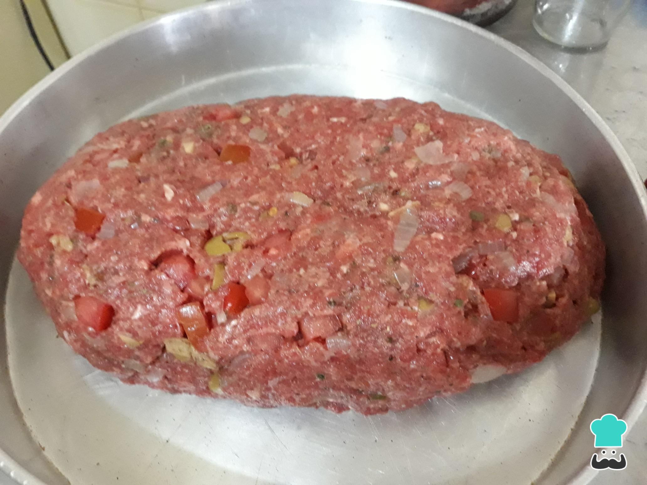 Em uma assadeira forme um rolo de carne, ou uma grande 'almôndega' com a massa de carne moída. Reserve.