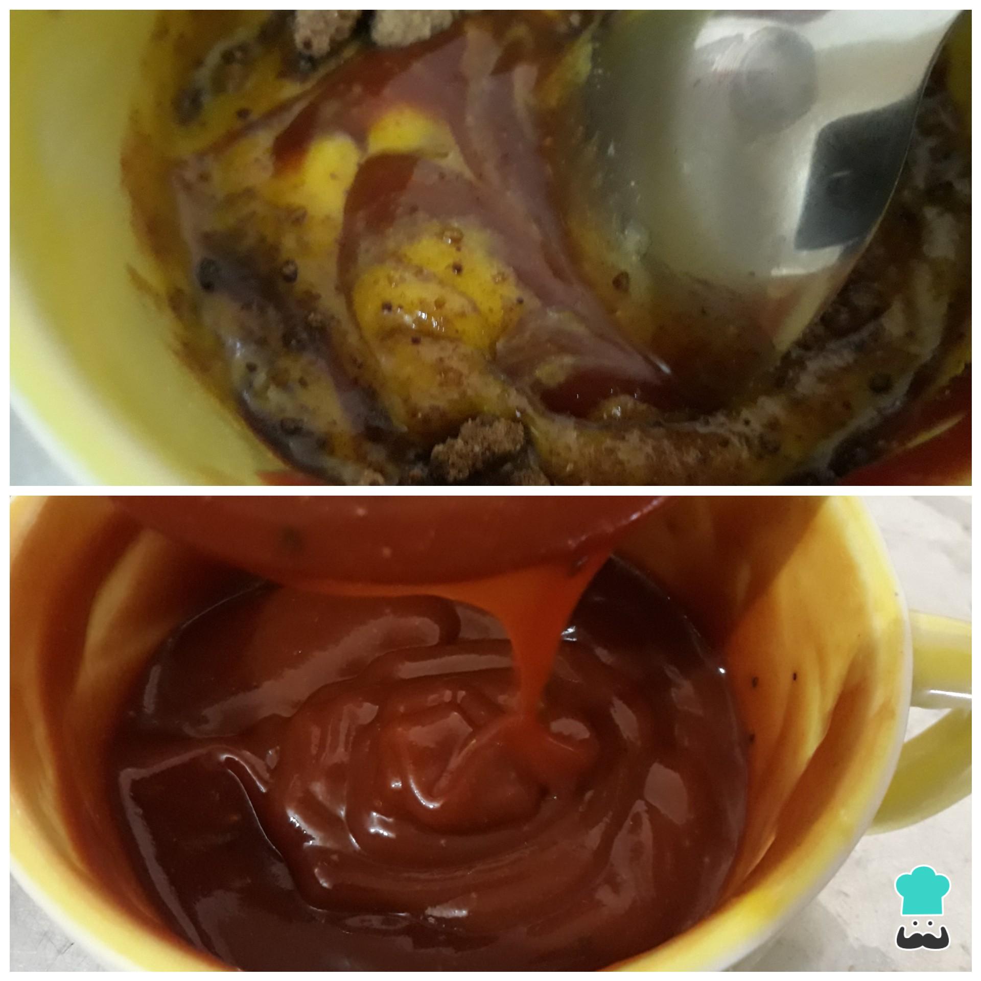Em uma tigela prepare o molho desta receita com carne moída: misture o ketchup, a mostarda e o açúcar mascavo até ficar bem homogêneo.