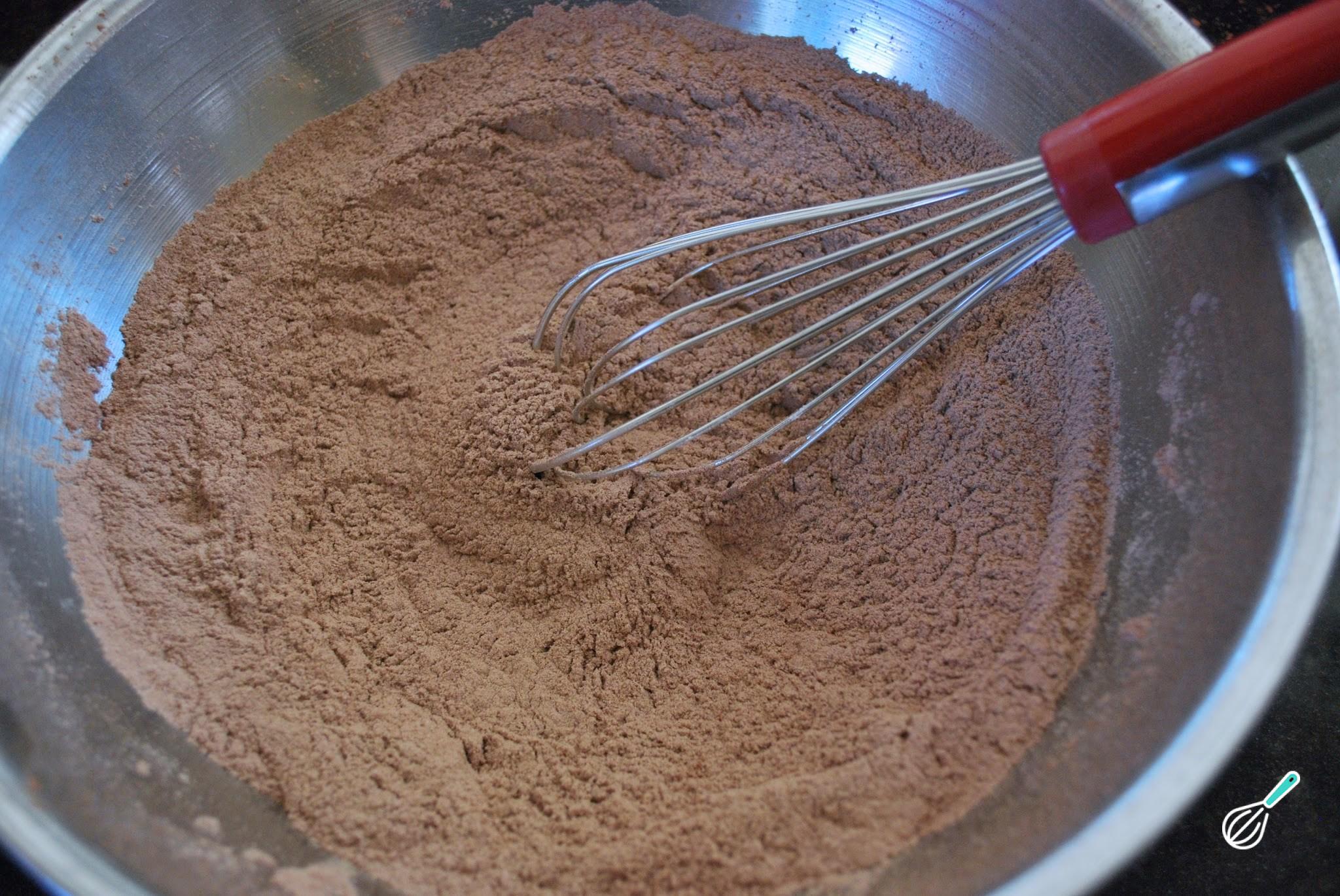 Pouco a pouco acrescente o açúcar e continue batendo por mais 2 minutos, até virar uma mistura brilhante e volumosa. À parte, misture os ingredientes secos peneirados: a farinha, o cacau e o fermento.