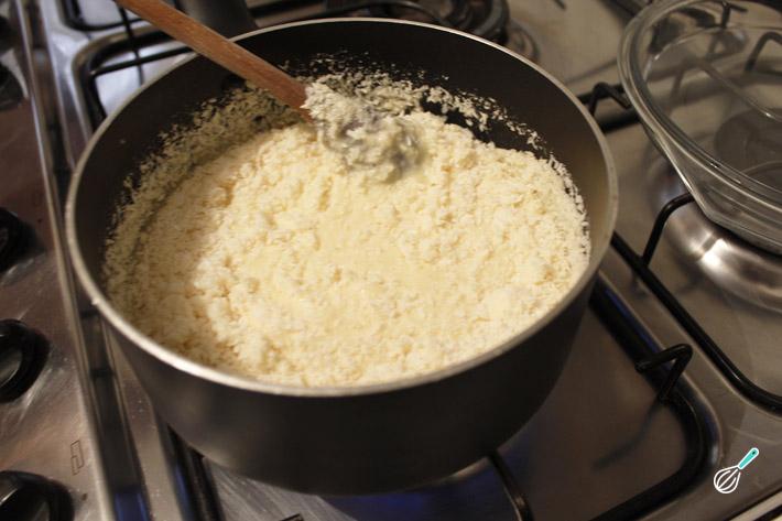 Enquanto o bolo assa, prepare o recheio de coco: simplesmente coloque os ingredientes respetivos numa panela, leve ao fogo médio e mexa até ponto de brigadeiro mole.