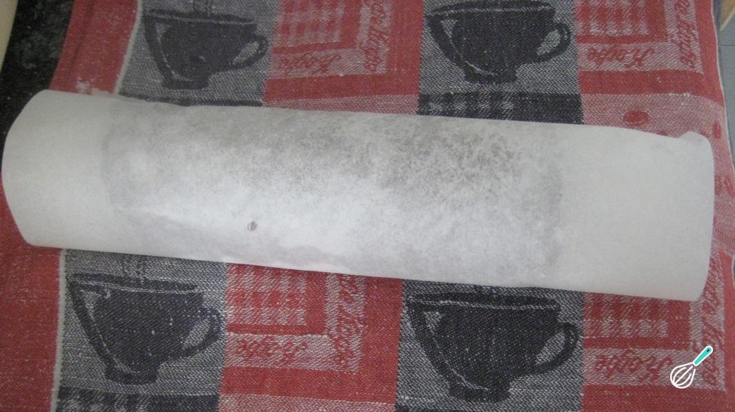 Retire a massa do forno quando estiver pronta, e desenforme sem tirar as folhas de papel manteiga. Depois sim, desgrude o papel manteiga que ficou por cima, espalhe o recheio e enrole a massa com a ajuda do papel manteiga que está por baixo, pressionando e desgrudando à medida que enrola.